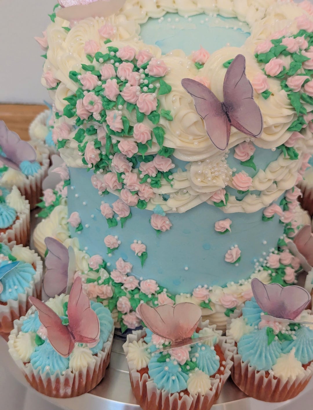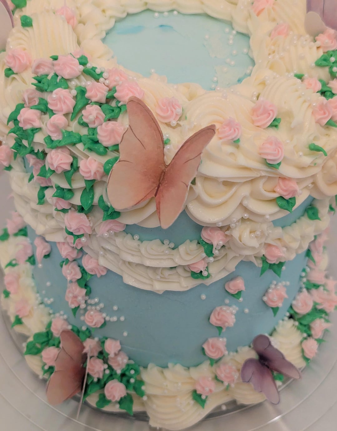 I saw this style cake on Instagram and thought it was so amazingso I had to try it for a birthday for my relative. It came out so amazing! I've never done this much piping. I got the sugar paper butterflies off Amazon.