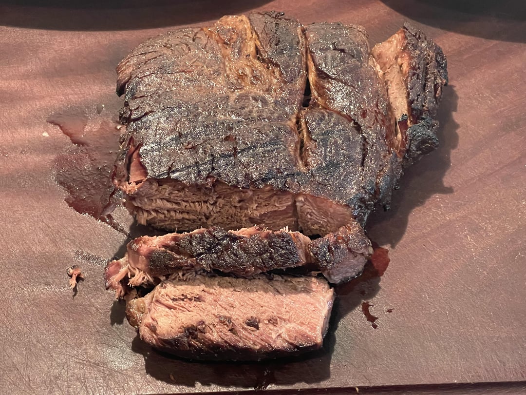 Shreddable for Au Jus dipping 173° for 24 hours, chilled for 20 minutes, seared over charcoal for one minute per side.