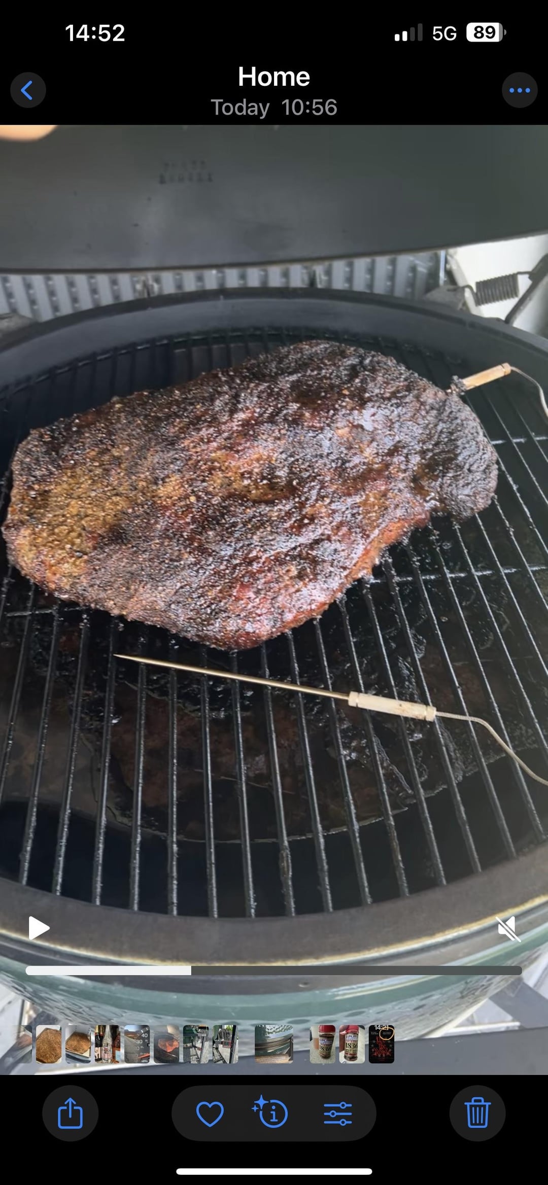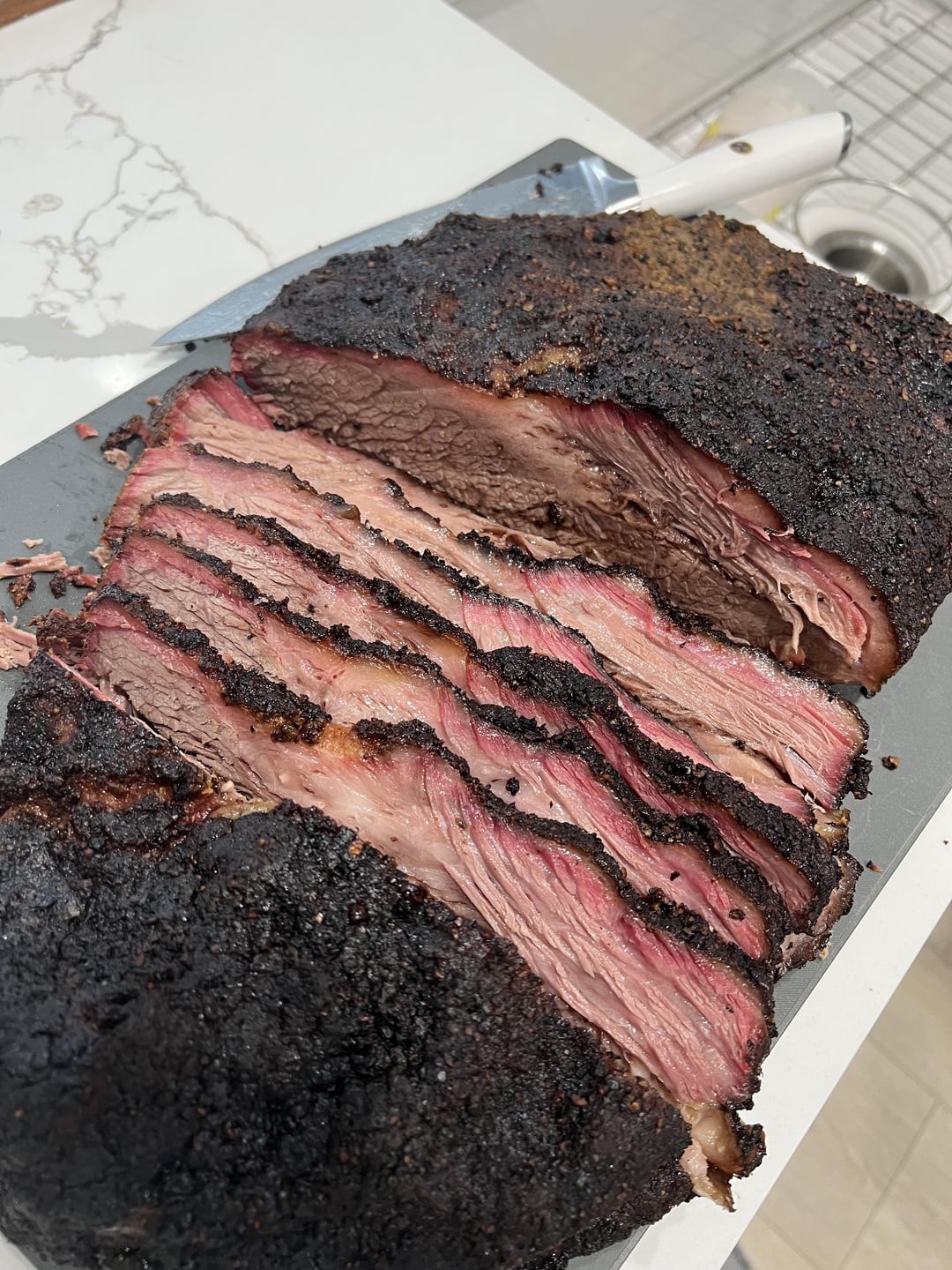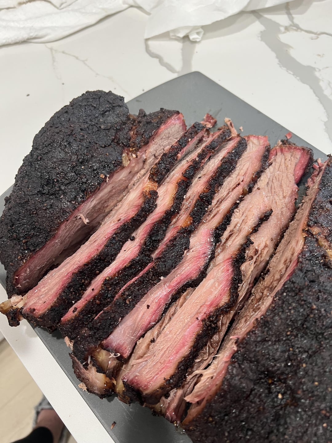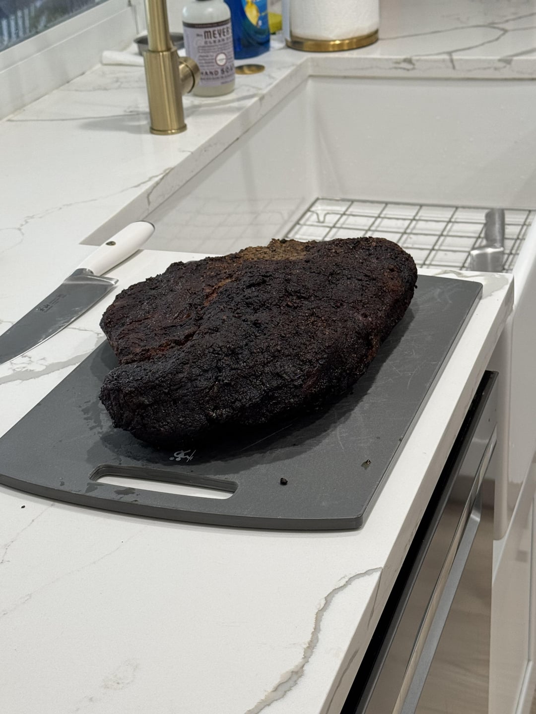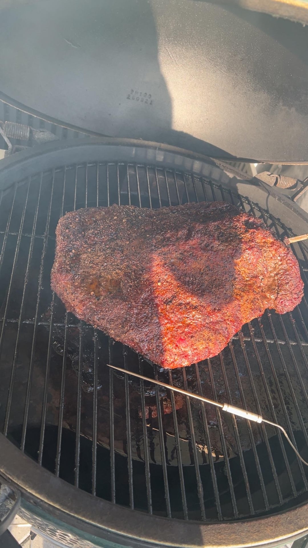 So this is my first attempt at brisket on the BGE. Biggest take away for me is learning to trim it better. Did well with the trim but you can see that one light brown circle where it just moisture pooled. Dropping your brisket in the freezer for 30min-1hr keeps the fat firm to get a smooth trim. Going to do that next time. It was well chilled but a little more firm would have helped a lot.