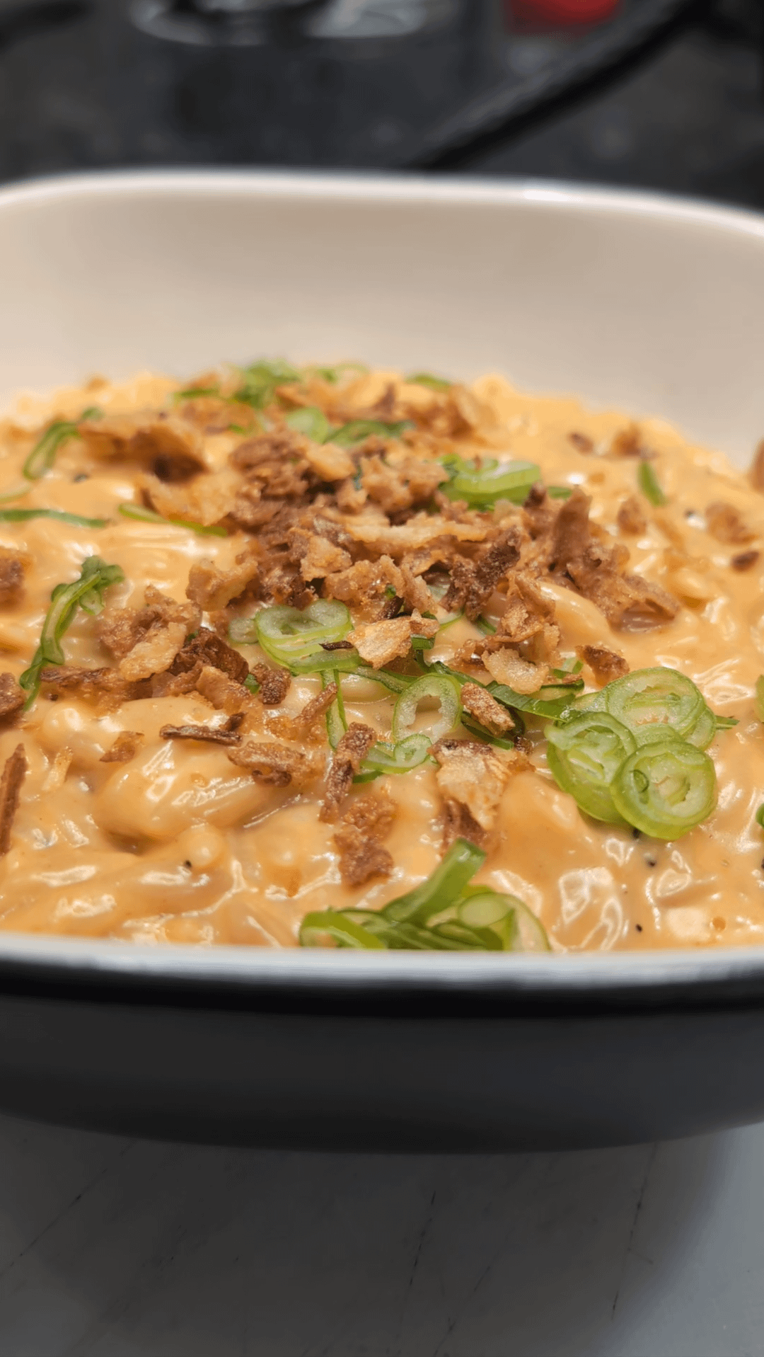 Toss Orzo into sauce or sauce into Orzo and cook on low heat until thiccc. Garnish with sliced green onions or put into greased casserole dish, add more cheese on top, and bake at 350°F for 30ish minutes or until cheese is crispy and golden.