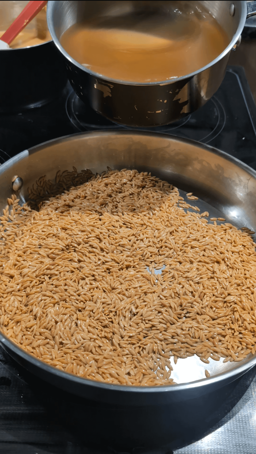 Toast Orzo in a bit of oil in a medium heat pan. Toss/stir frequently until golden brown in colour. Add in hot stock, season with salt.