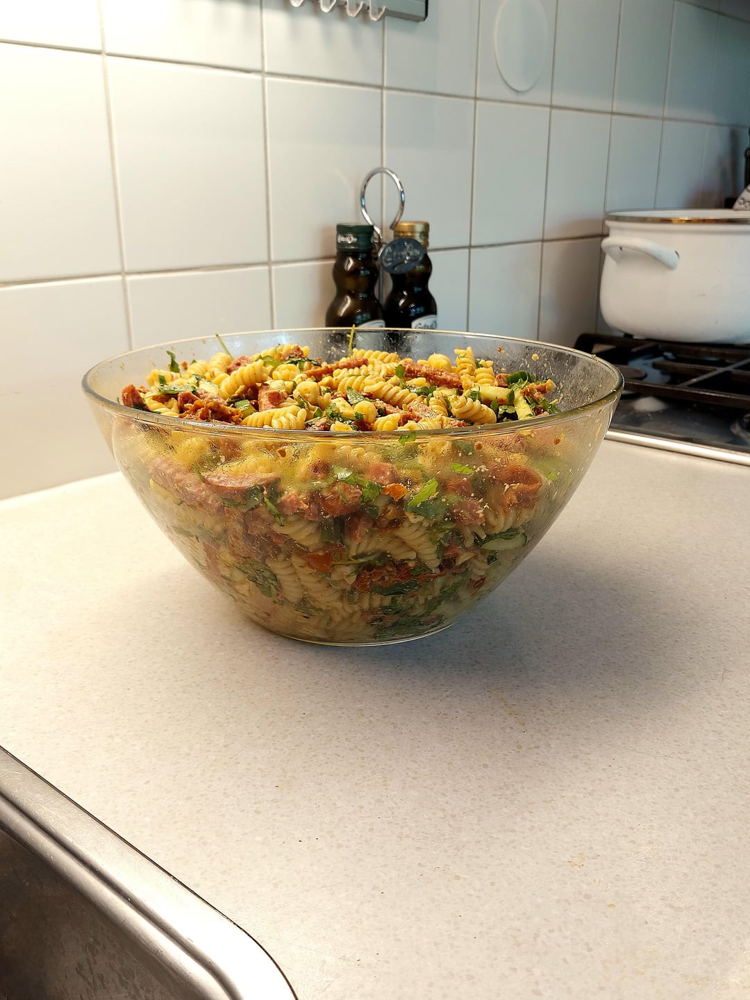 Made with a cucumber, 80g arugula, 500g salami, 150g sundried tomatoes, 400g mozzerella, 100g pesto, 500g fusilli by dontthinkabouttitt 2 Comments That-Gyoza-Life-44 4 months ago Looks delicious! And a nice, big batch too! How was it? Abner211 4 months ago Yummy 😋Write A CommentYou must be logged in to post a comment.
