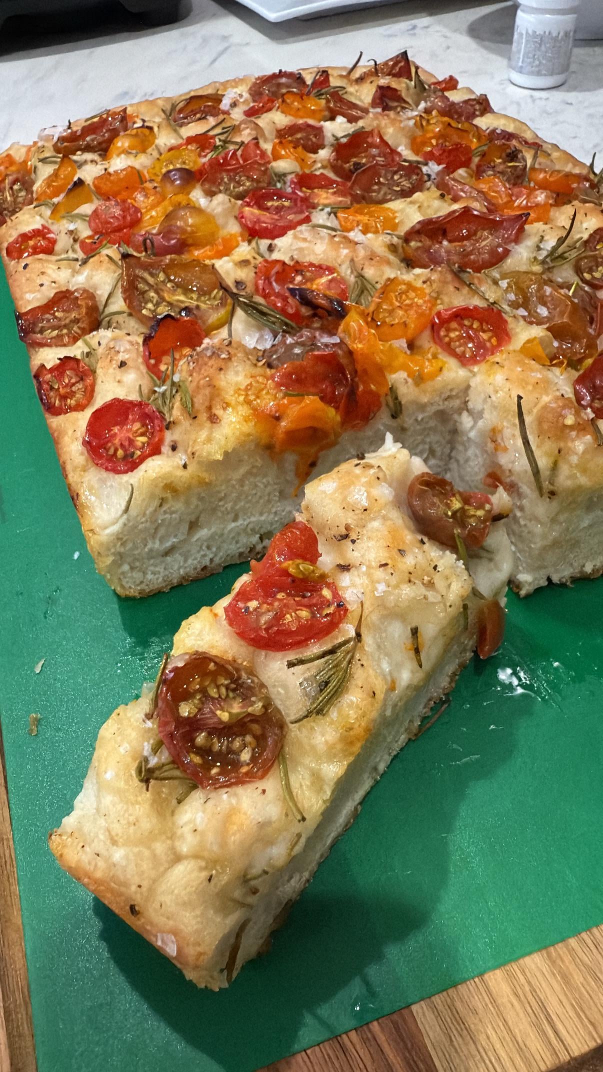 every year I have way too many 🍒🍅 and use some on bread. not the best focaccia, but it tastes good! maybe some parm would be good too