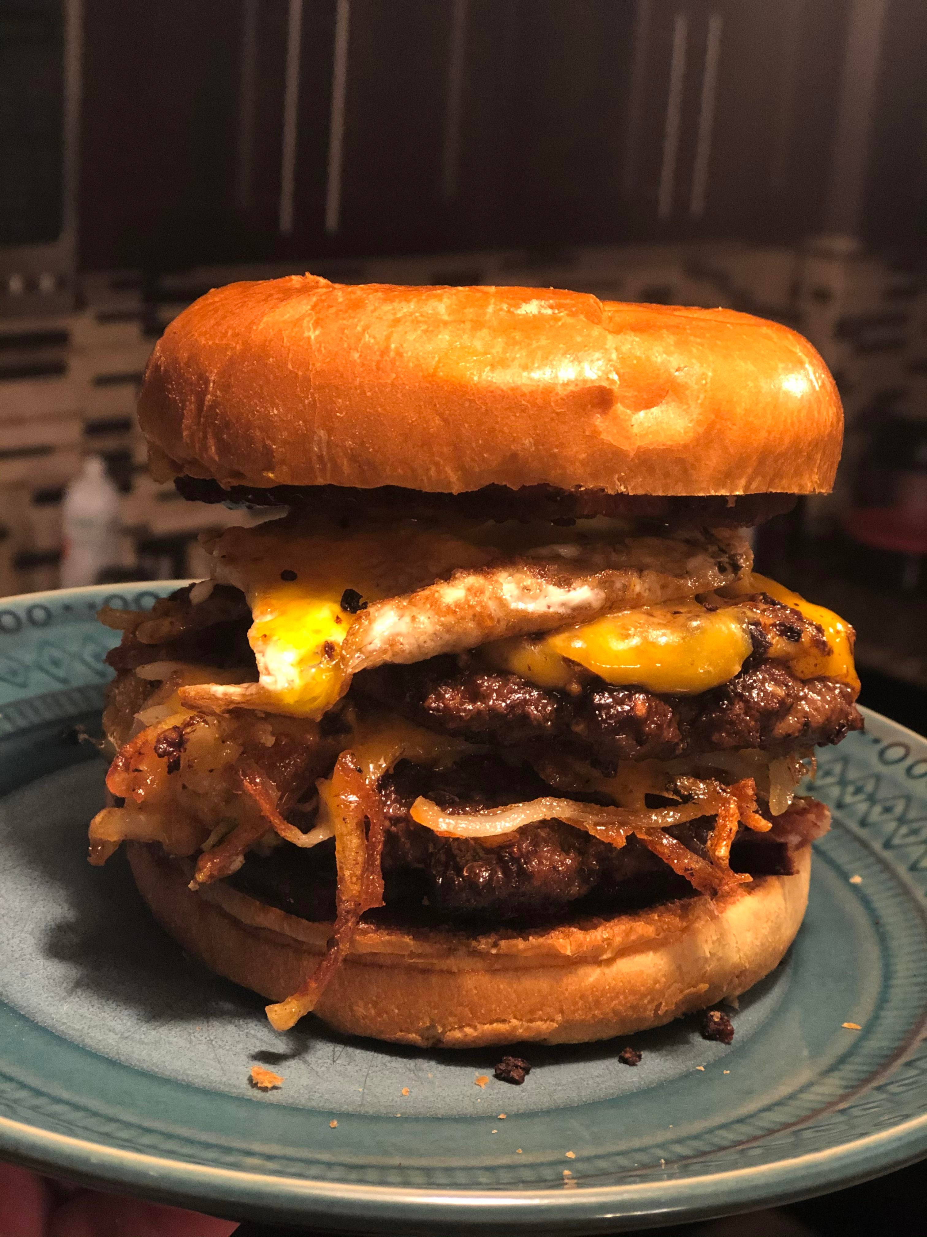 Double smash breakfast burger with egg, hash browns, bacon and cheese