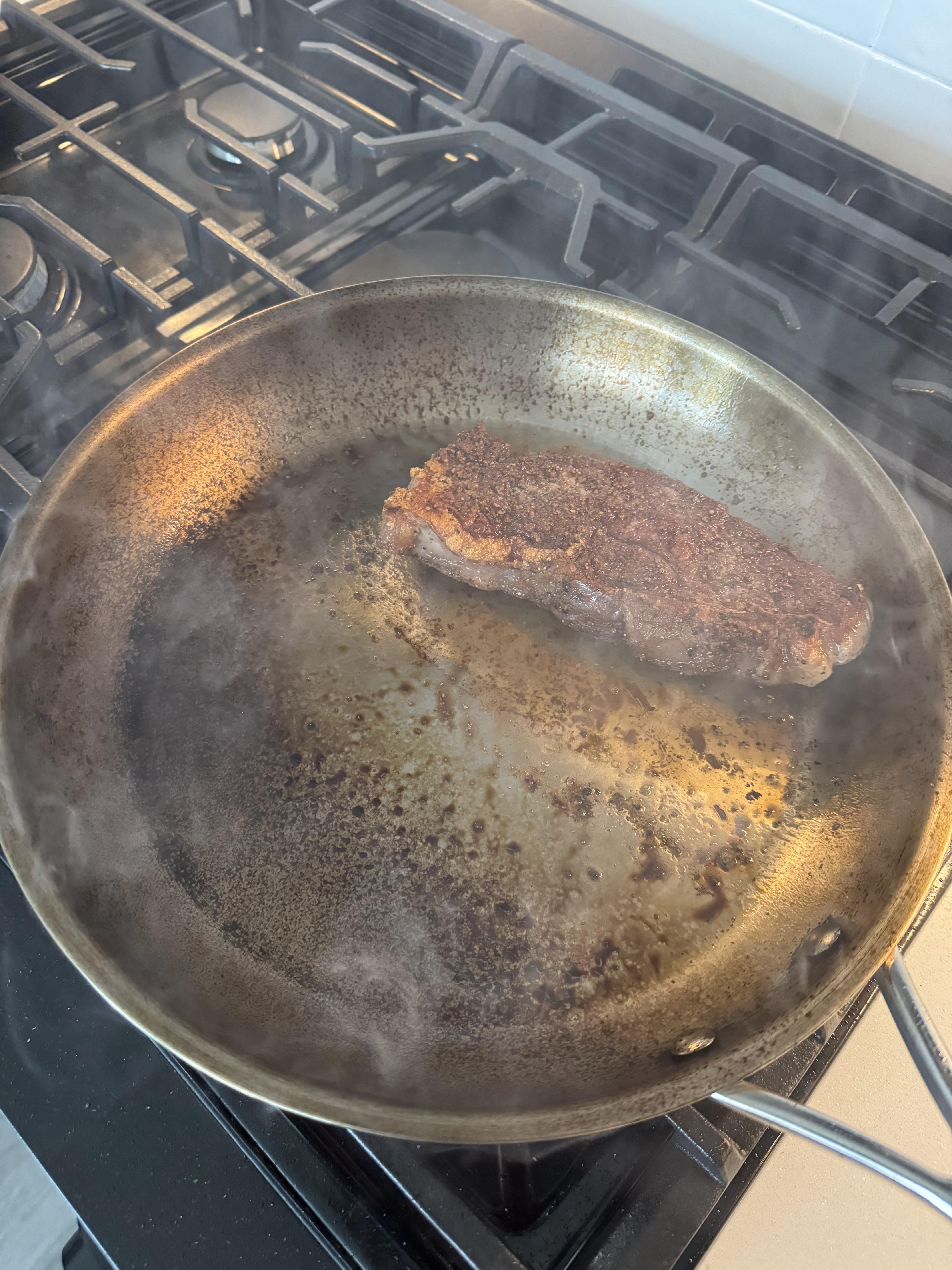 Pan medium heat, five layer, steel avocado, oil, pepper, salt, and steak before adding to pan no matter what I do I can’t figure out why