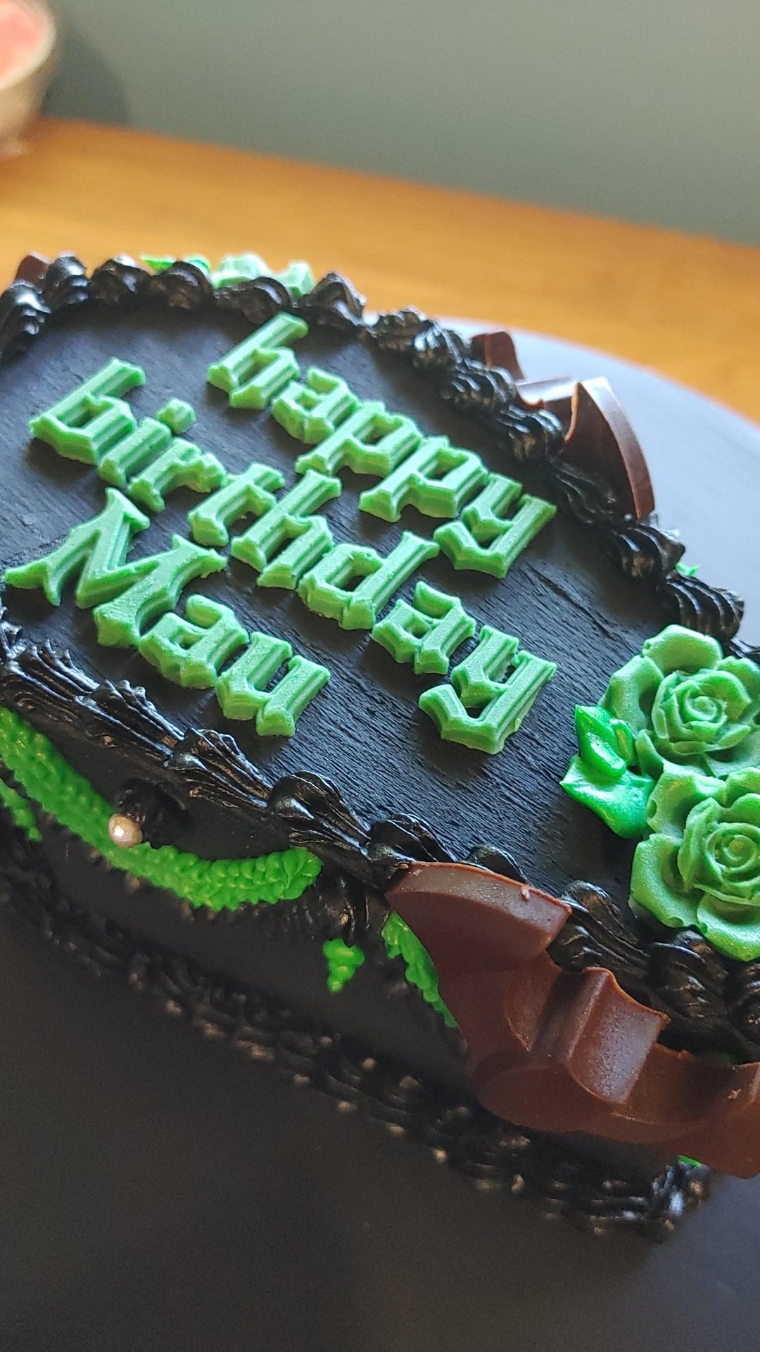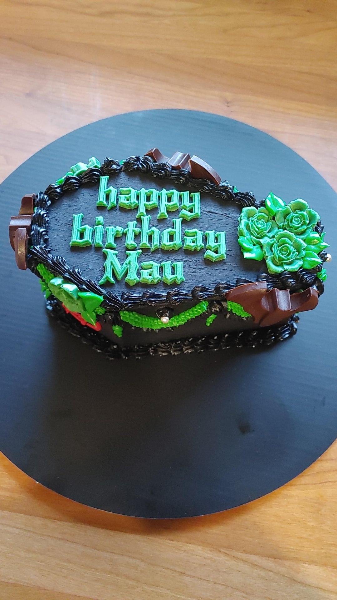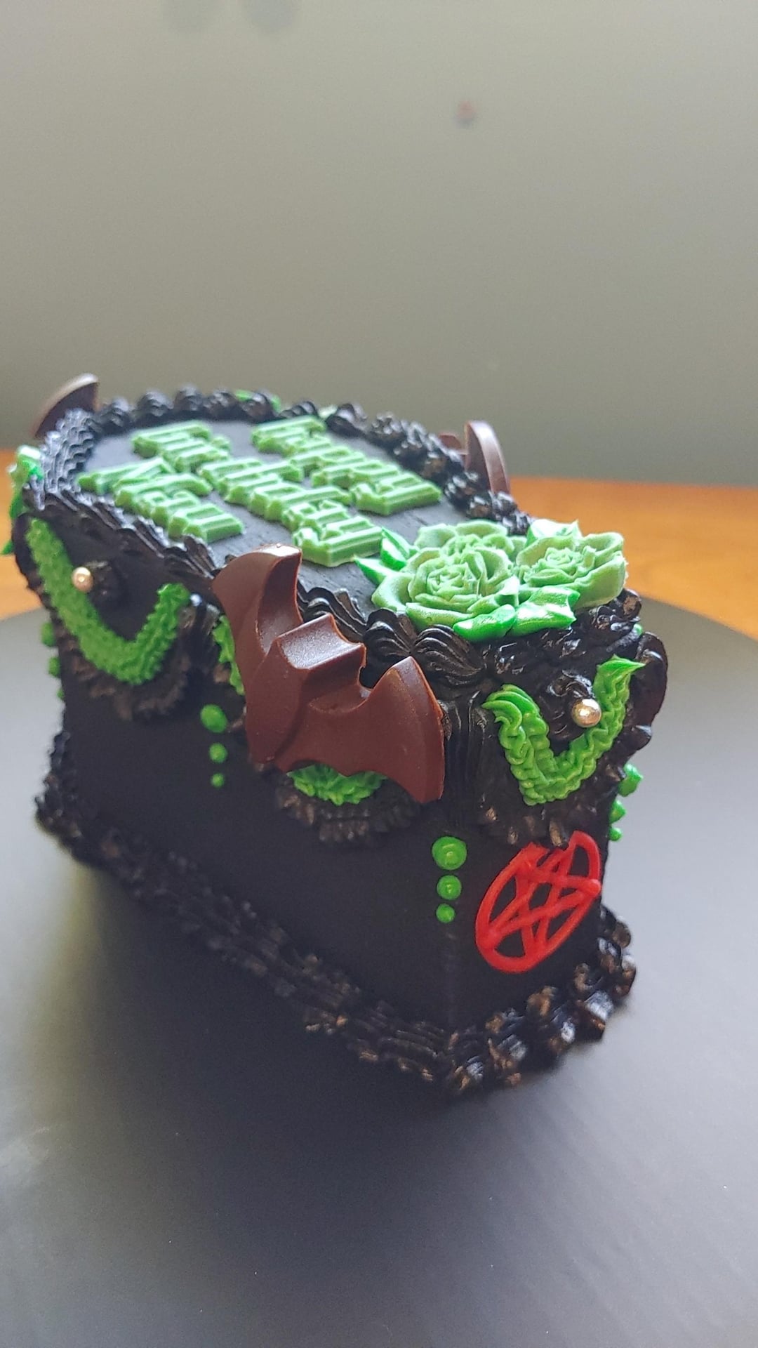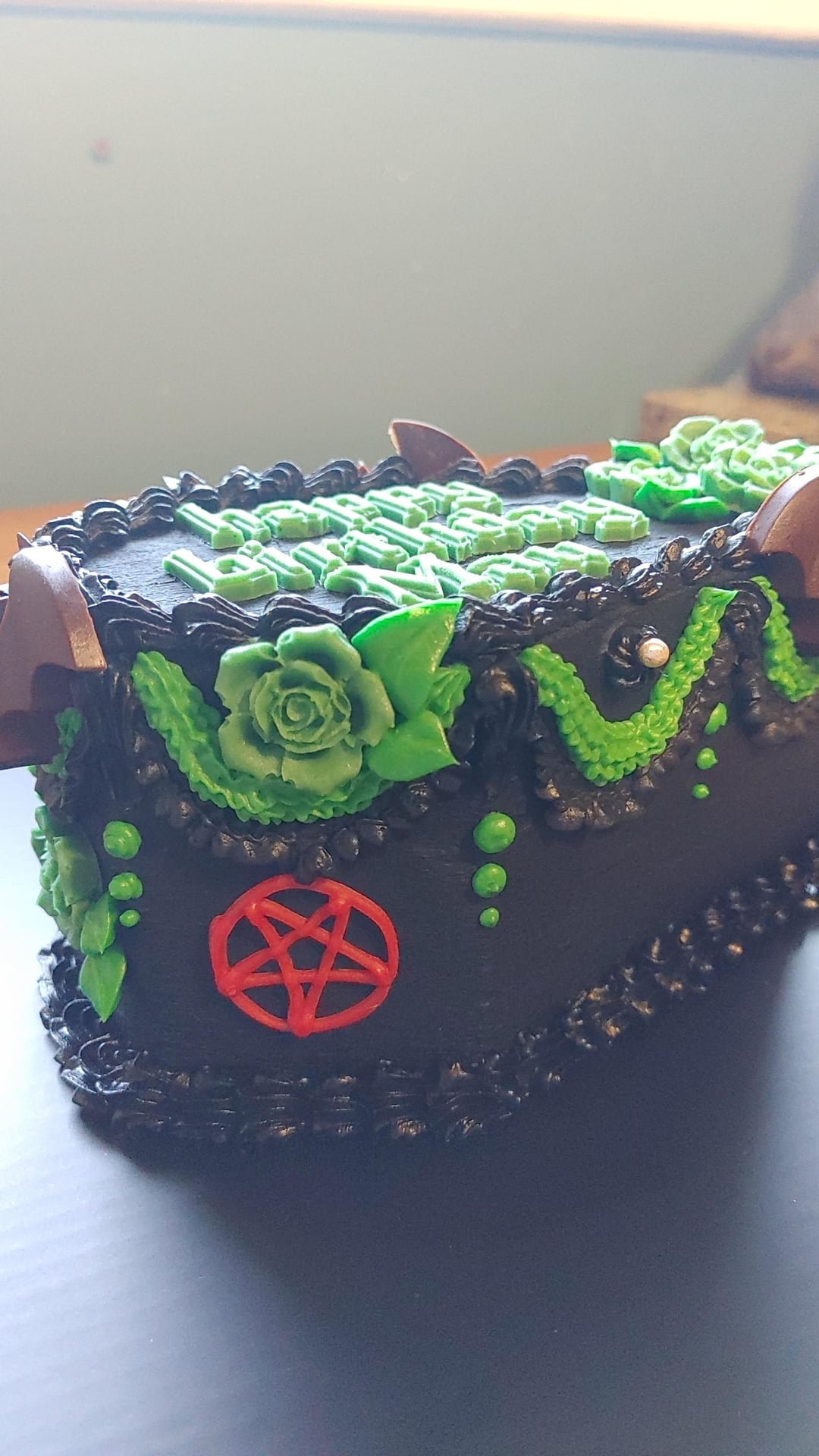 Requested: black coffin cake with a few green pipped accents. Add chocolate bats, green roses, green birthday message & a few red inverted pentagrams.