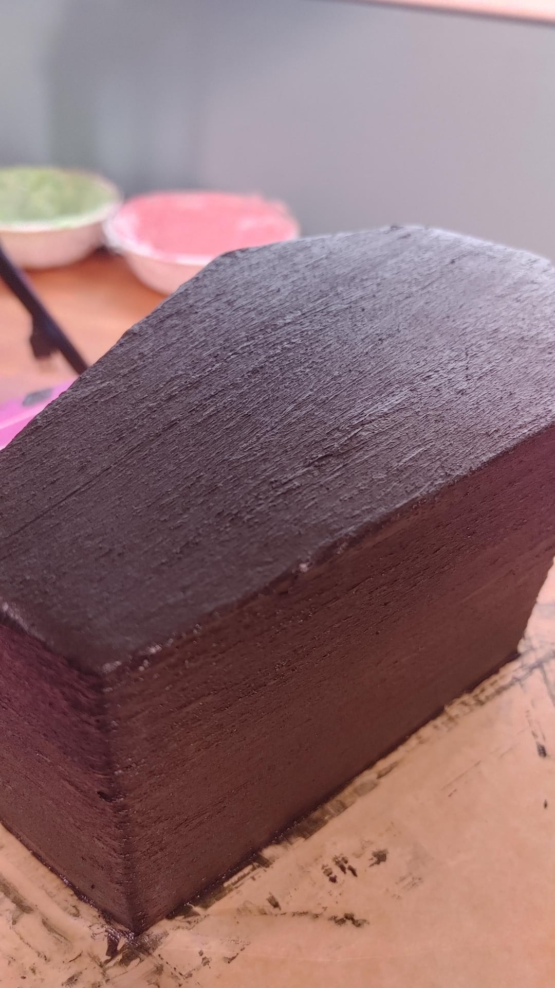 The cake is a 3 layered marble cake with black chocolate buttercream, the brighter green is also buttercream but vanilla flavoured. Roses, lettering & inverted pentagrams are coloured white chocolate. The bats are dark chocolate with a vanilla caramel filling. I also brushed the final buttercream coat to give a grainy/wooden coffin effect!