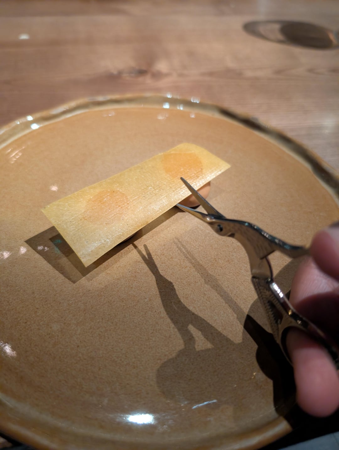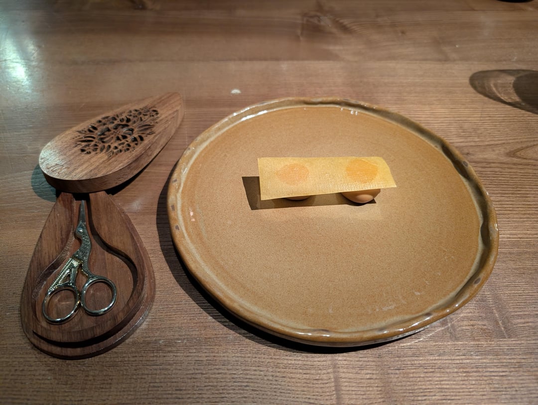 I included the last two photos because while they are on a plate, this course was definitely the low point. The first of the dessert courses, this was called rock, paper, scissors. You used the scissors to cut the "paper" between the two "rocks". They asked me if I could guess what the rocks were made with. First taste I got was passion fruit, which I love. But then something funky hit me. Truffle? "No, it's black garlic". Look, I like black garlic, but it does not go with passion fruit at all (there was also white chocolate in there).