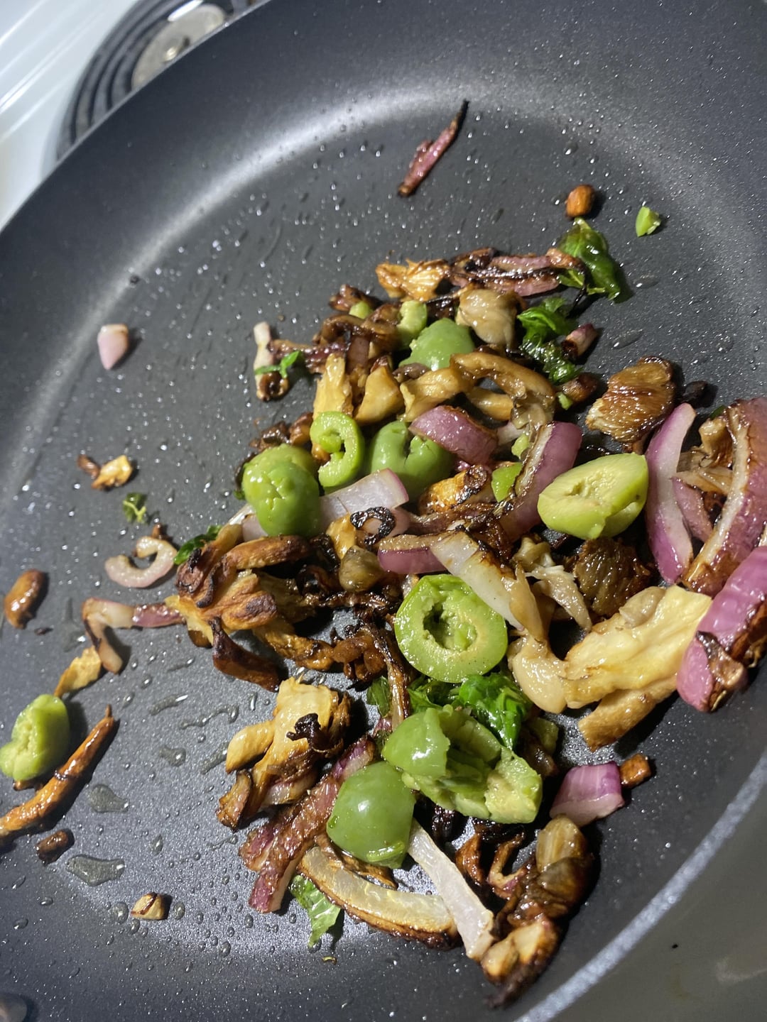 • In a skillet, sauté red onions and sliced mushrooms in grape seed oil until caramelized.