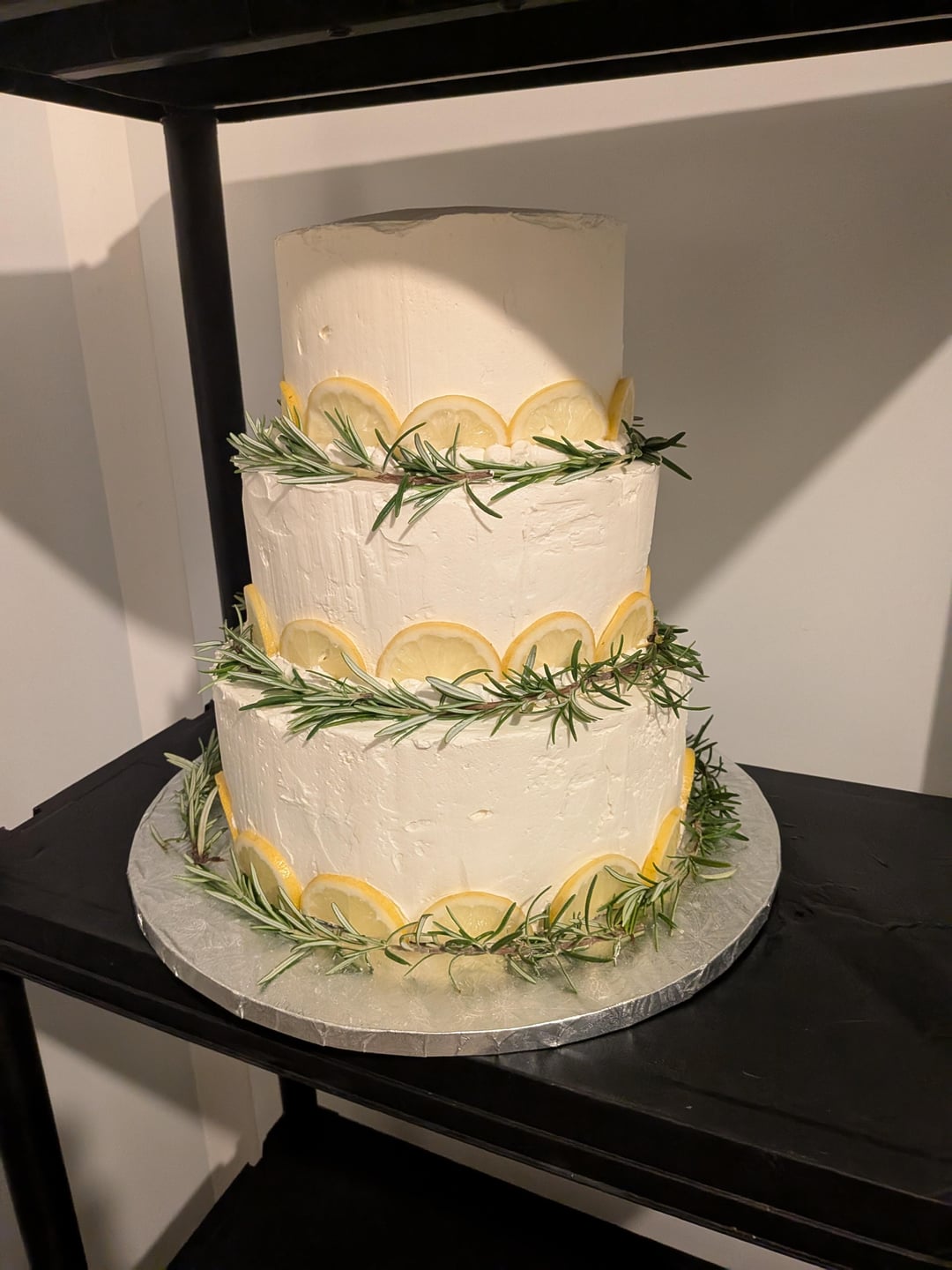 Rosemary-lemon flavored cake. Lemon curd. Rosemary infused chantilly. Italian meringue buttercream with a slight note of rosemary and lemon.
