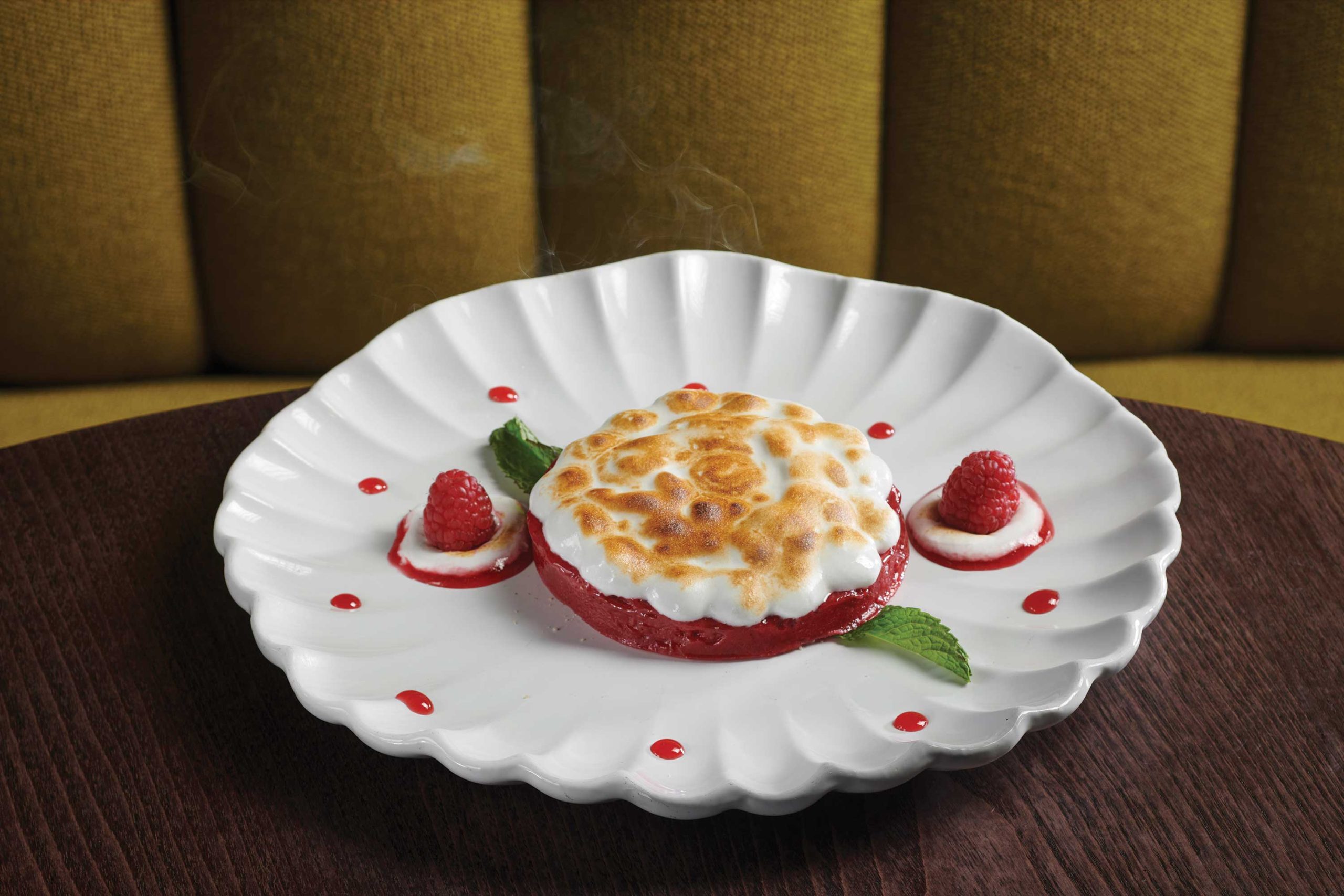 I want to love Meringue on Fire – a light, cool combo of raspberry sorbet, lemon jam, berry coulis and Italian meringue – but the rum that flames this dessert also overpowers it.