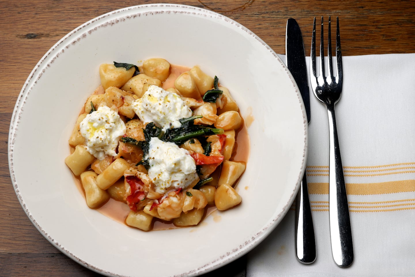 The gnocchi return. They are as pillowy and delicate as ever. They tumble together on the white plate, interspersed with pieces of lobster, dolloped with milky stracciatella cheese, which has all of burrata’s rich charms but is even looser and more relaxed. There’s a little bite from dandelion greens, a little lift from fennel pollen. The sauce is swoony, with deep lobster flavor, a bit herbaceous from the fennel.
