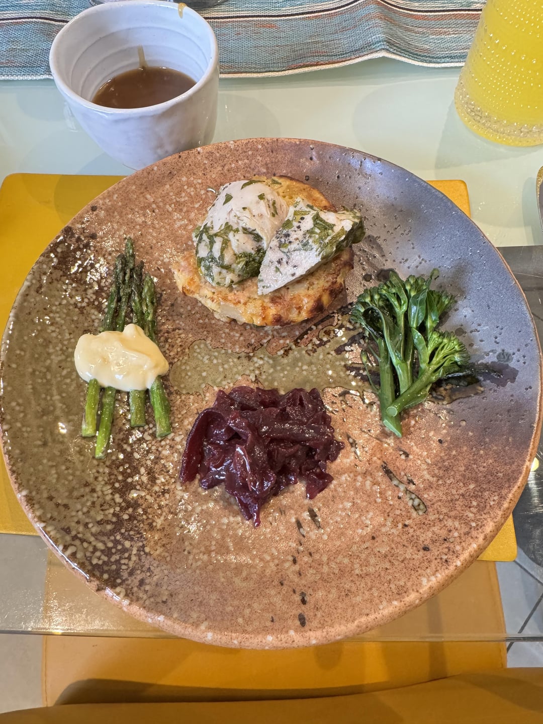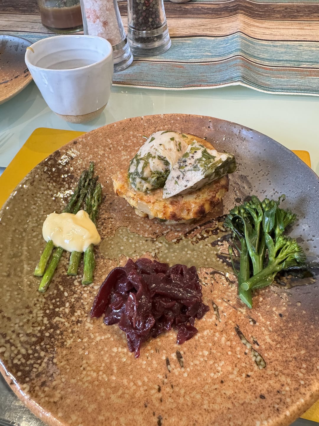 Roast turkey in tarragon butter on a pea, leek and ham hock potato tortilla, with chicken sauce, tender stem broccoli, asparagus tips with hollandaise, and spiced red cabbage and bramley apple.