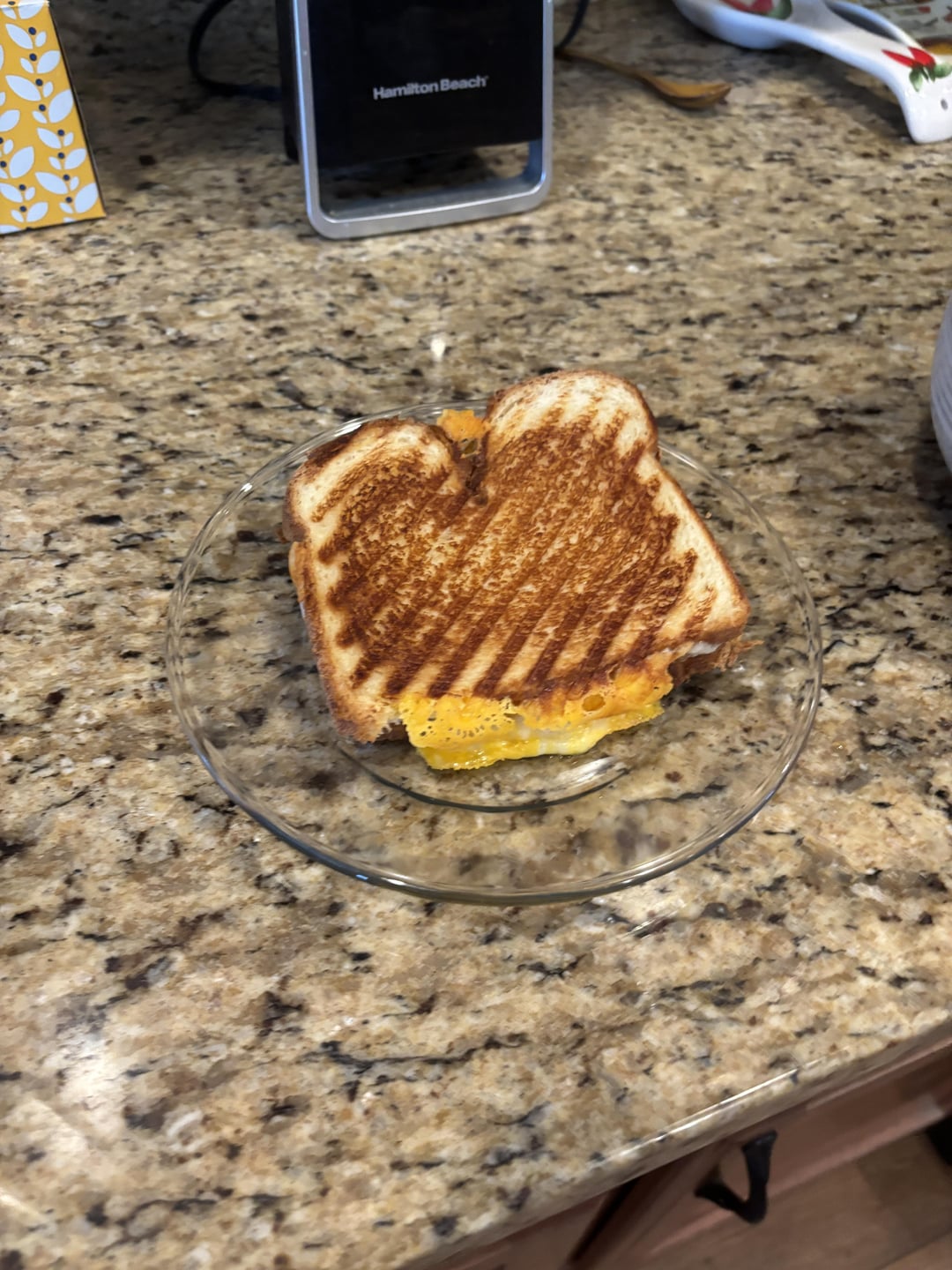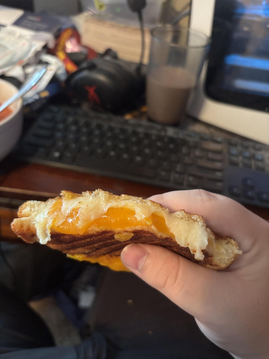 Aged white cheddar, sharp cheddar, provolone, and Monterey Jack (there’s a white cheddar-Gruyère mix in the back but it turned out moldy, so that was a no-go) on buttermilk wheat bread with salted whipped butter on the outside, cooked in a stovetop panini press until golden brown. 10/10, would eat again.