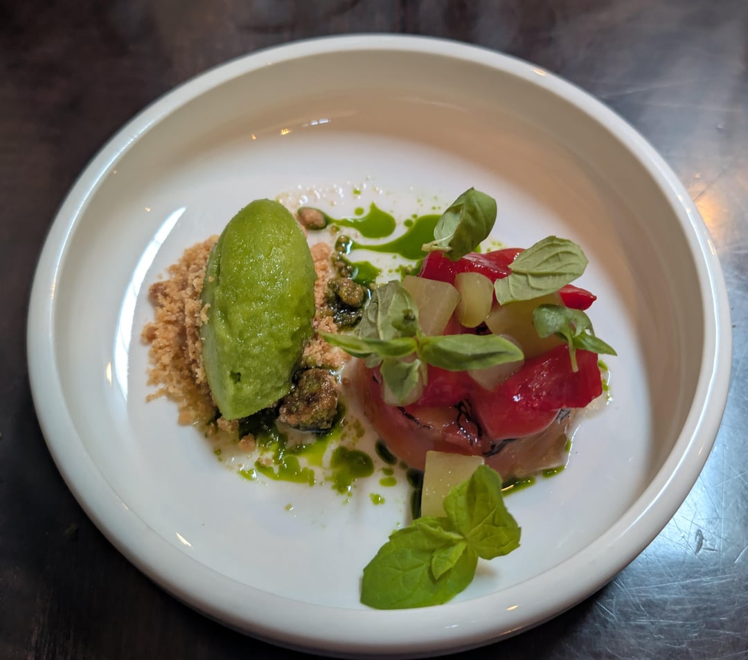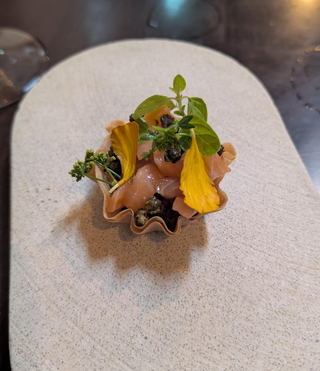 Lightly cured salmon, crisp pastry, flavourful beetroot, subtle dressing of elderflower and aperol