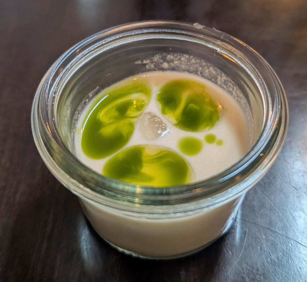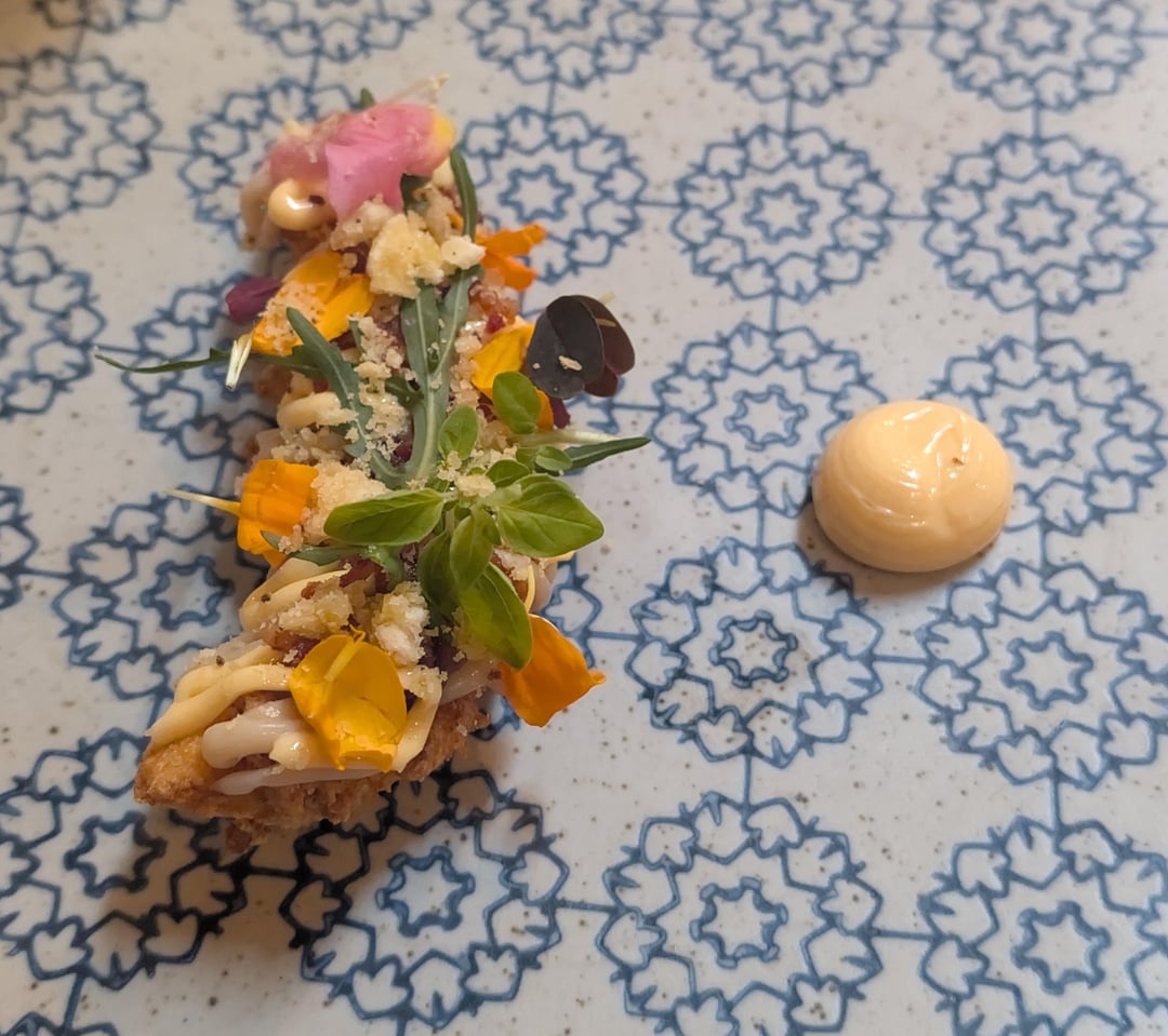 Fried chicken, vegan banana sauce, peri mayo. Beautiful moist fried chicken, great crisp and crunch. Subtle spice from the peri mayo, sweetness from the banana