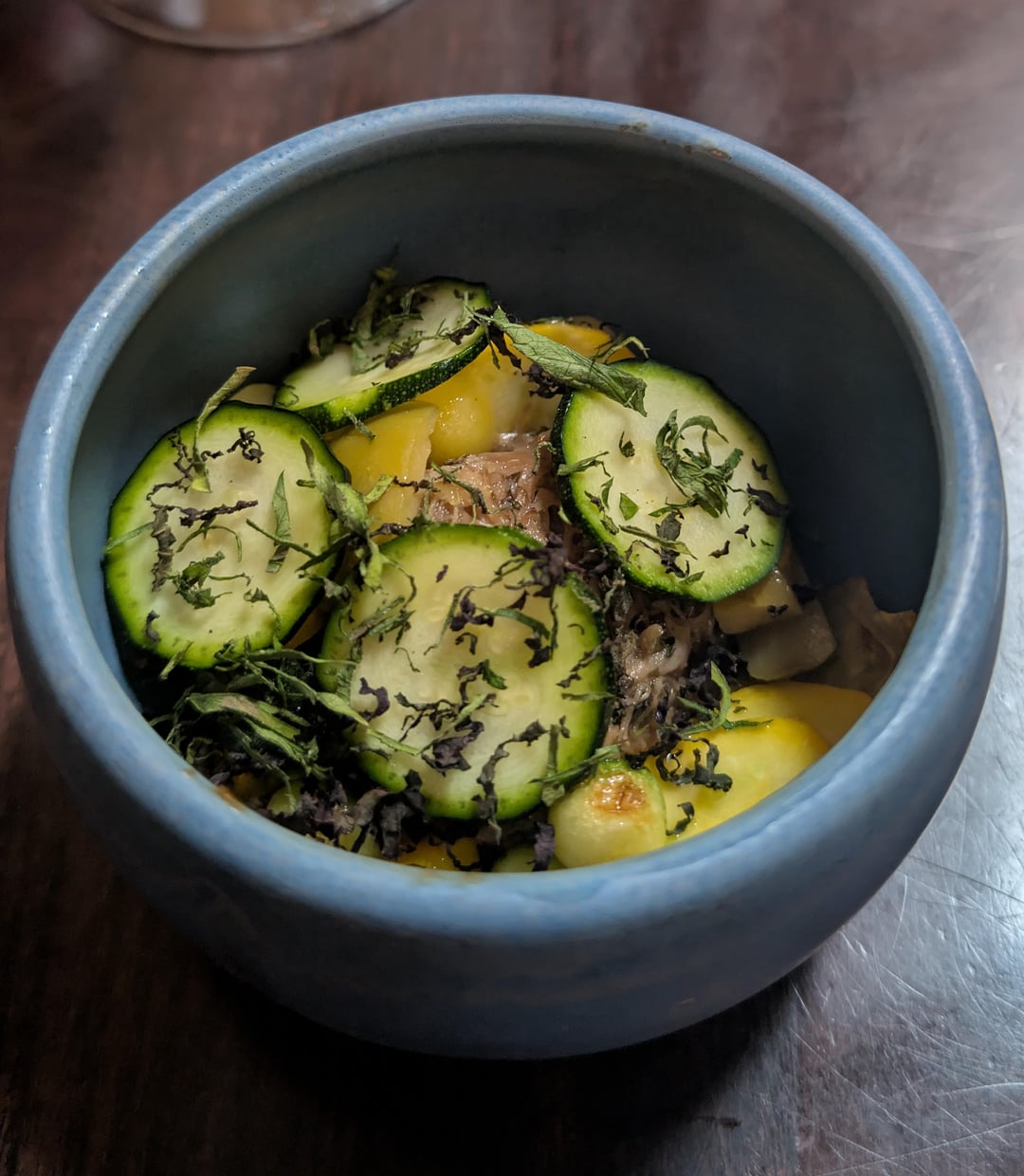 Very subtle. Meaty slow cooked lamb, tender. Nicely cooked courgette added a bit, along with creamy feta and a hit from the olives