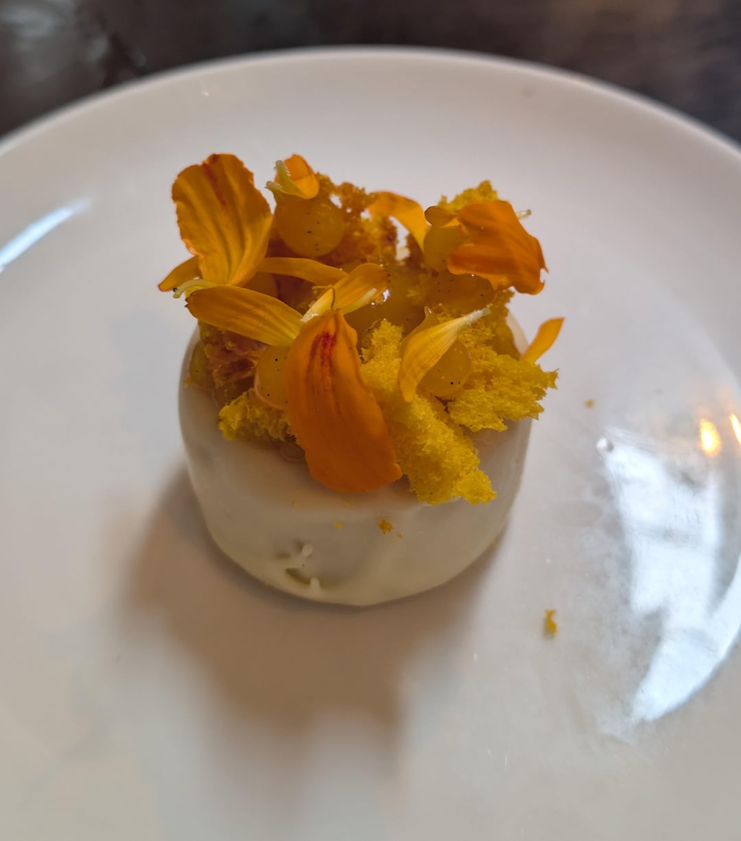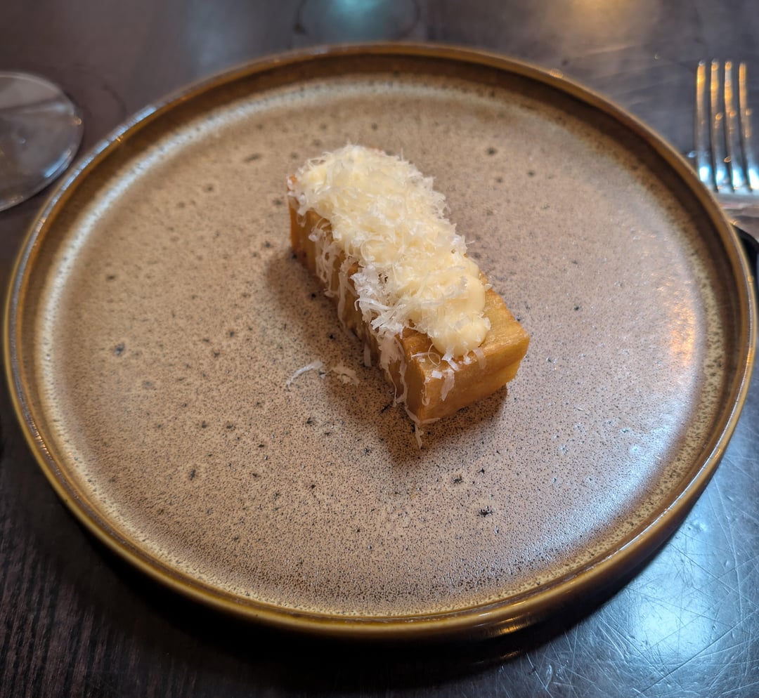 100 layered chip, isle of mull cheddar custard. Crispy and soft inside chip, rich cheddar custard, yet well balanced. An imaginative dish that really worked
