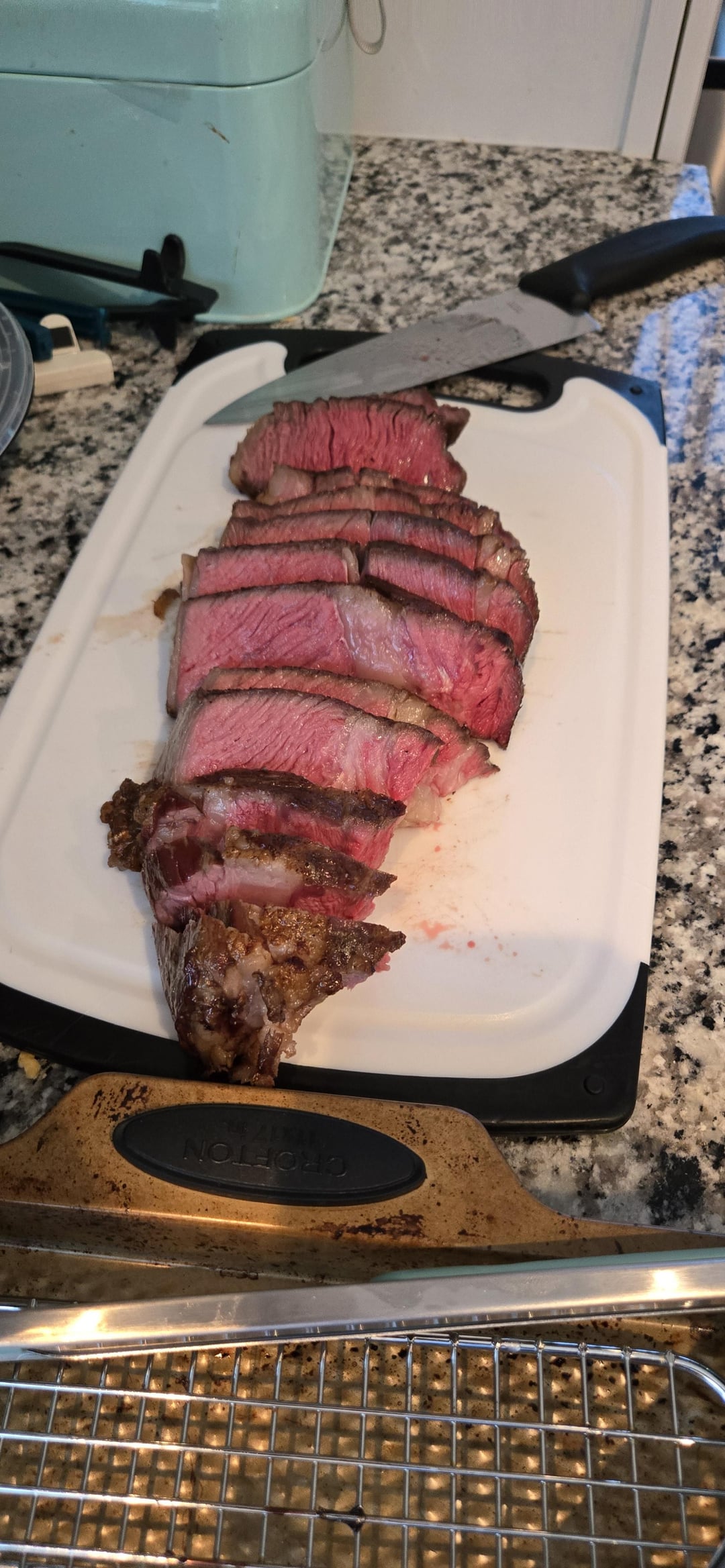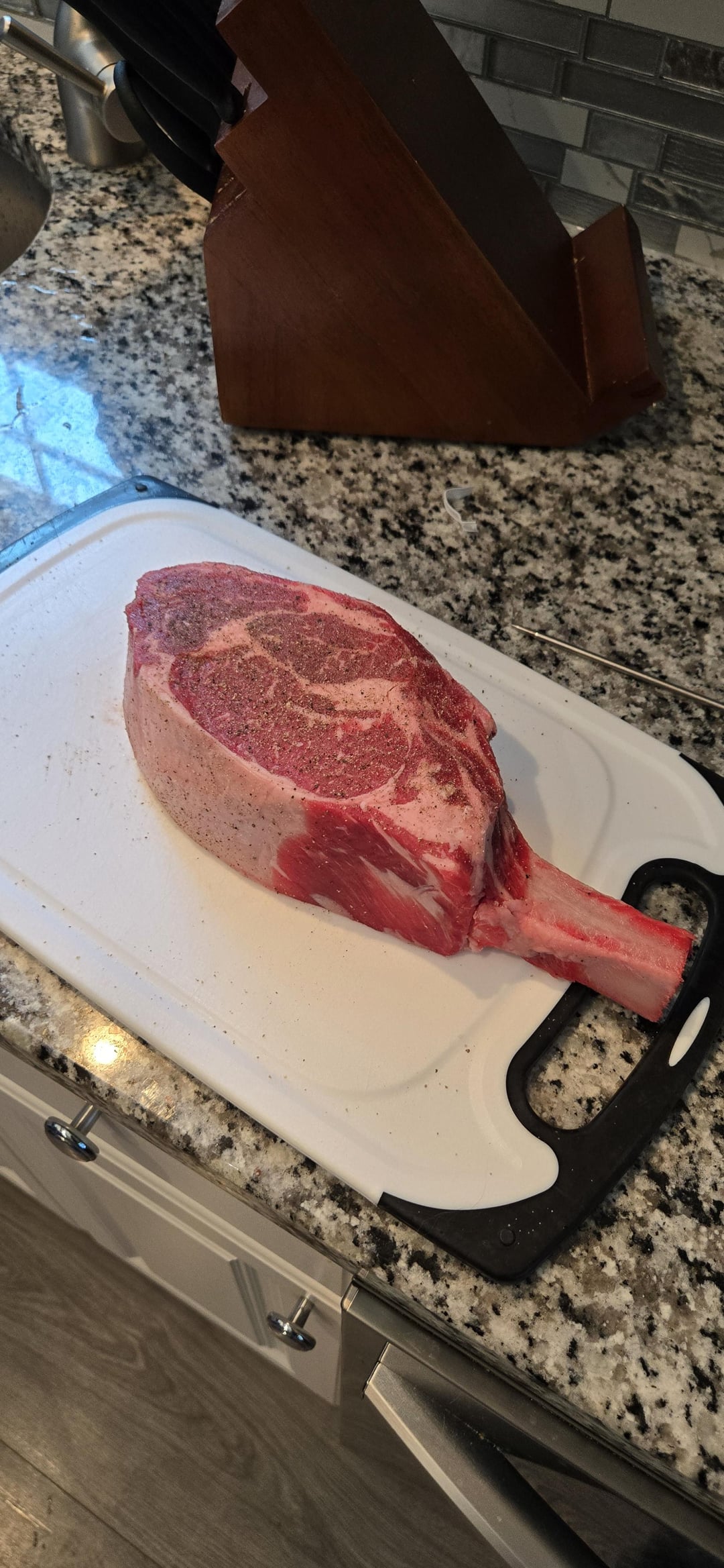 Salt and pepper In a 250 degree oven until 125F Wanted to sear in my cast iron but the bone didn't fit so we went with butter in a non-stick pan. About 1 min each side max Rest 7 minutes Let me have it! What could I do better