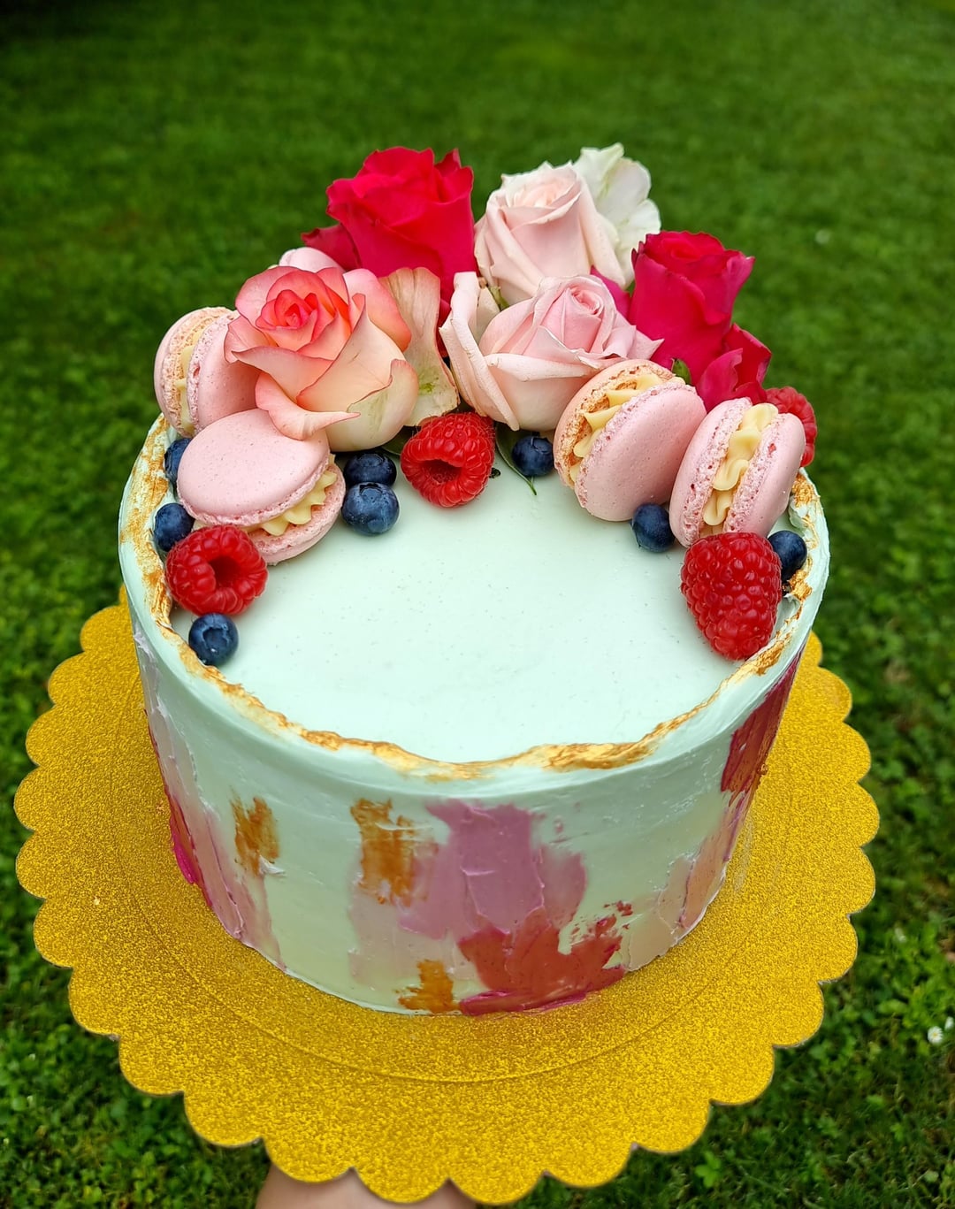 Love it. The colors are great, and the macarons are such a clever addition. Plus the ‘painted’ frosting on the sides (don’t know what to call it). But a good combo of details.