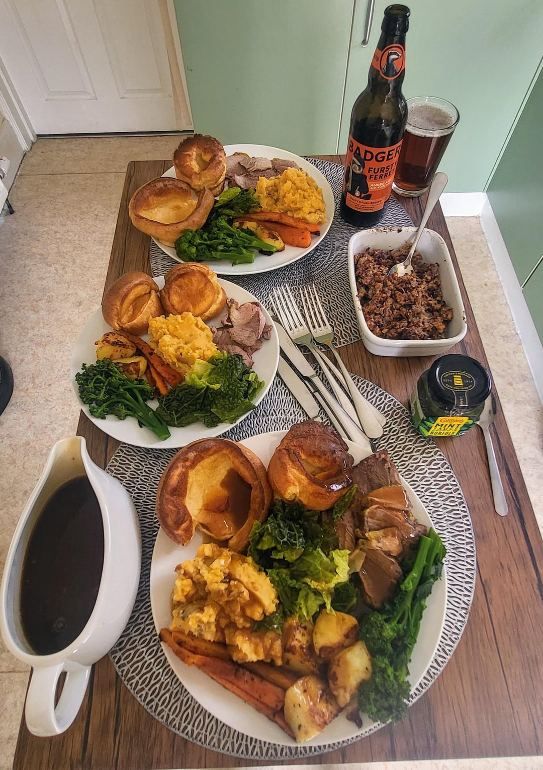 Roast lamb, Yorkies, roasties, savoy cabbage, carrots (just roasted, no glaze!), tenderstem broccoli, stuffing, and a jug of rich gravy. Creamy mash made with unpeeled Maris Pipers and sweet potato. Washed down with a bottle of Fursty Ferret (Badger Brewery, 4.4%).