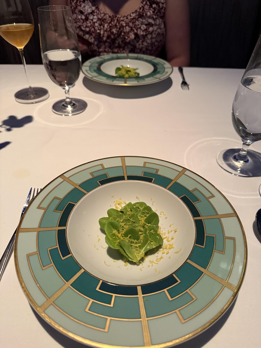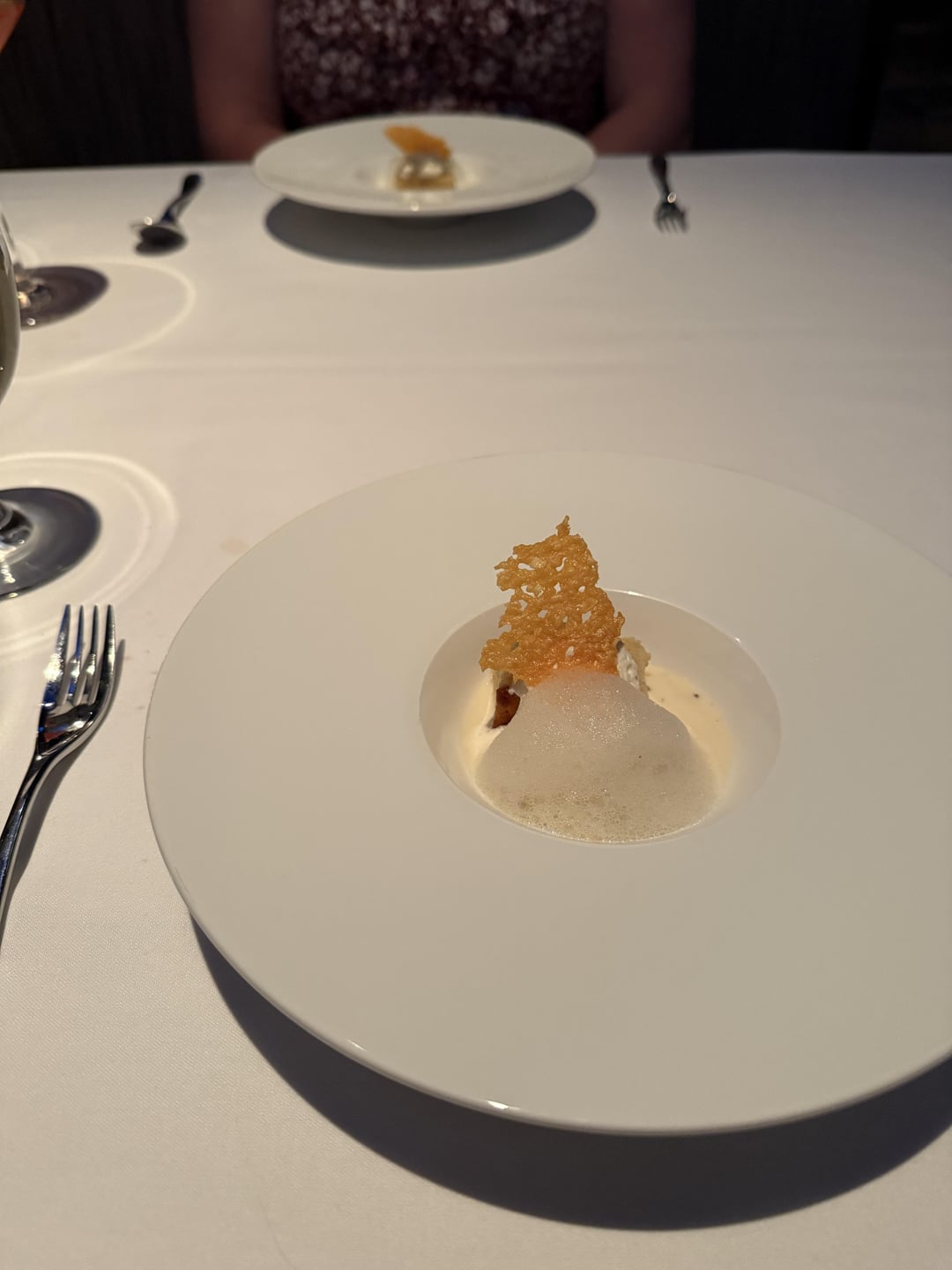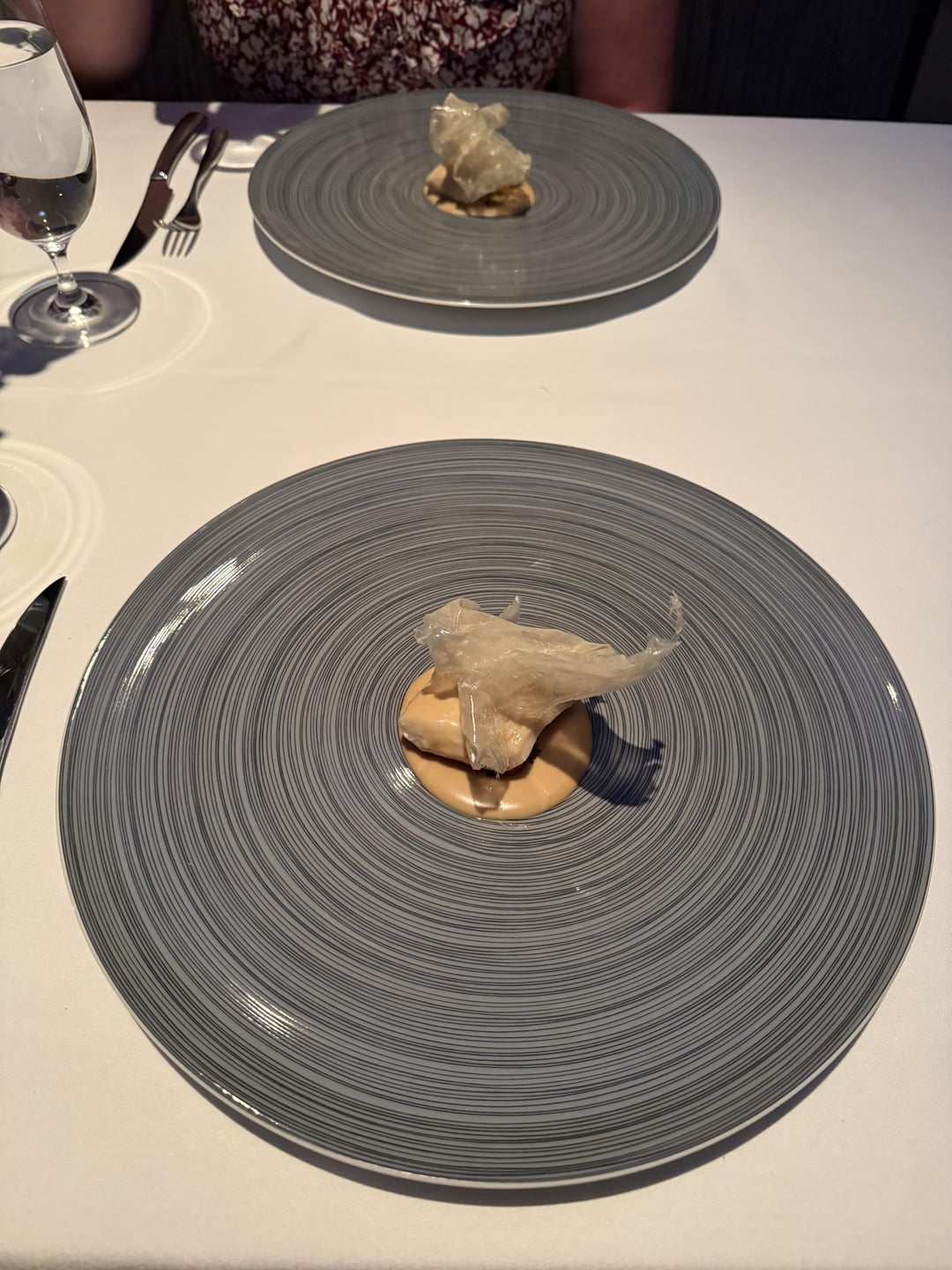 This course was good, but not the best. I think the egg yolk shaving could have some more flavor(I don’t know what flavor but I wish it stood out more) but the undercarriage was super salty(in a good way) and crunchy. The asparagus and snow pea really gave it a nice firm feel.