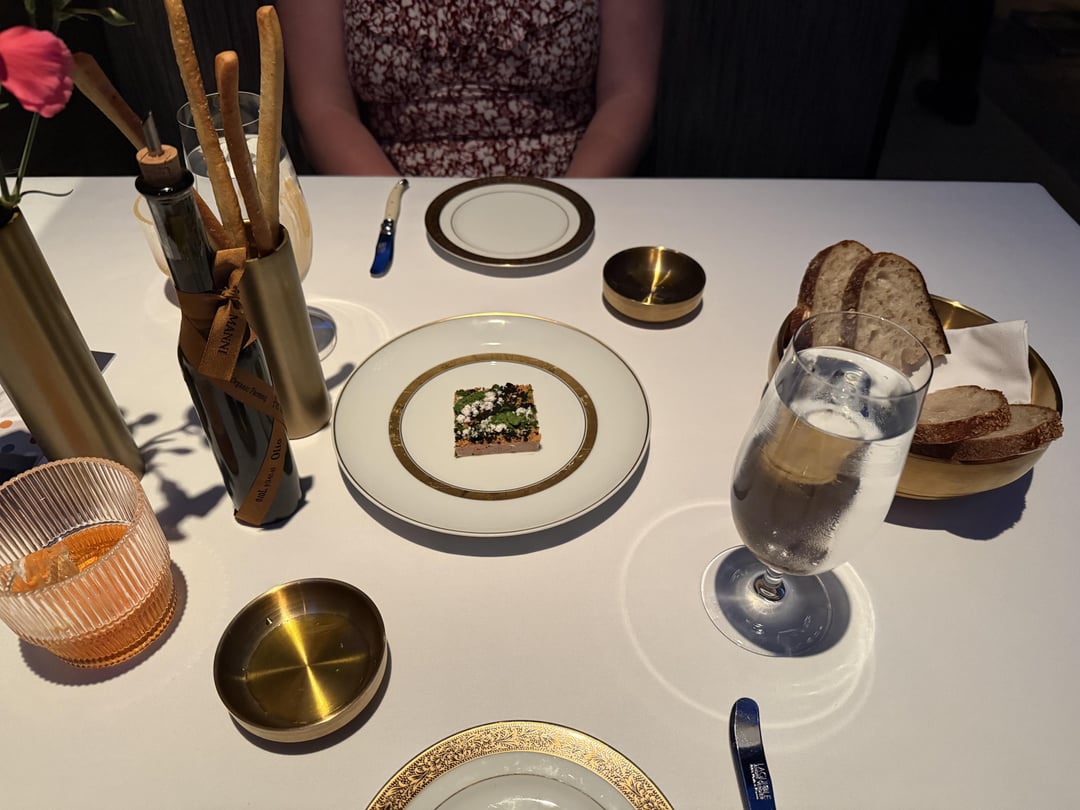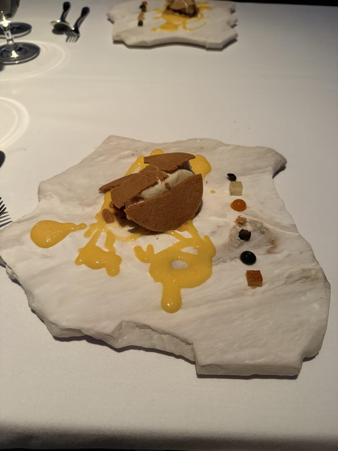I’m going to give this dish a 10/10 and say that it was my favorite of tonight. First off, I love the plating so much. The lemongrass gelato has amazing flavor and sweetness, but doesn’t overpower the other components. The limoncello really was a nice touch and I found myself scraping the plate for scraps of it. The tart was perfectly spiced and gave the dish a great crunch. The little bites on the side are meant to give the tart a different vibe for each new bite. I found this to be a fun activity.