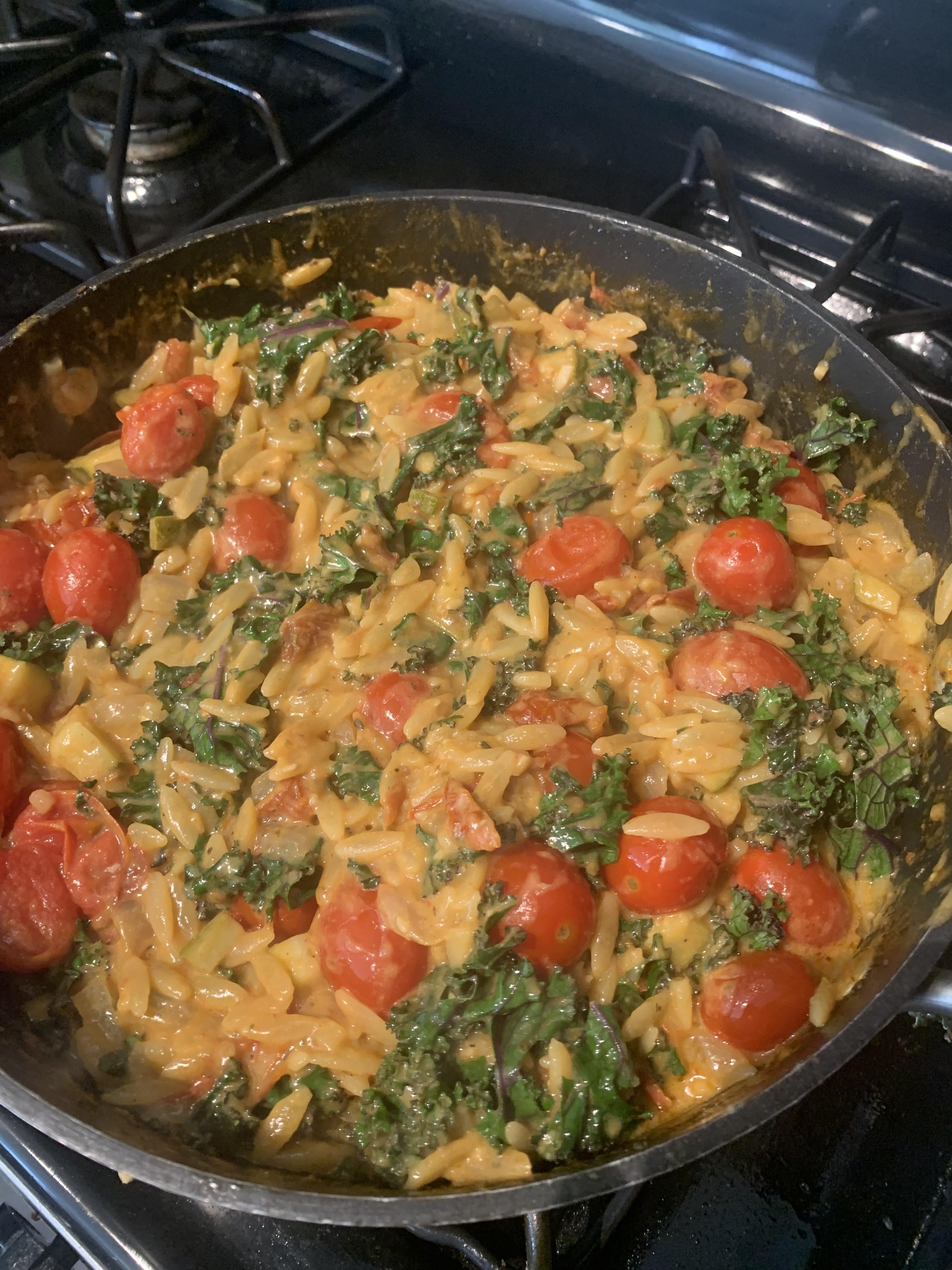 Made this Tuscan orzo with zucchini kale onion and sun dried tomatoes. It’s vegan but had it with chicken on the side