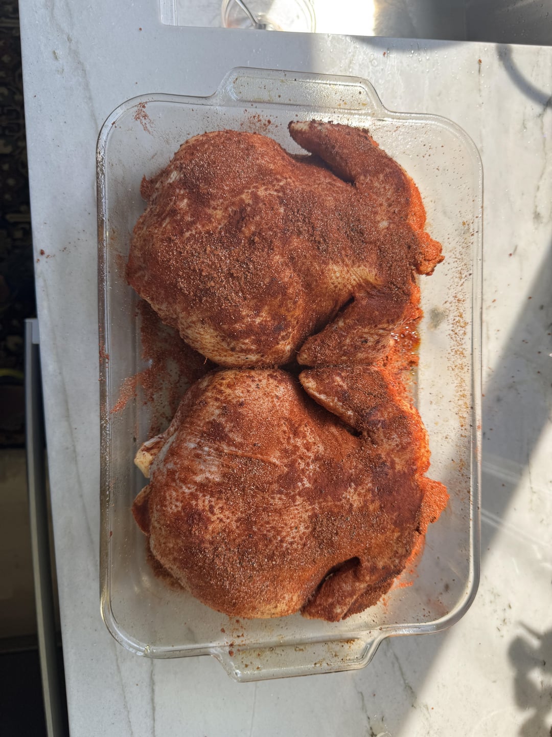 I like do my chickens either spatchcocked or on a chicken throne for beer can chicken. When you spatchcock the meat of the chicken is leveled out so it cooks more evenly. You can do this with turkeys too, I won’t ever do another turkey without spatchcocking.