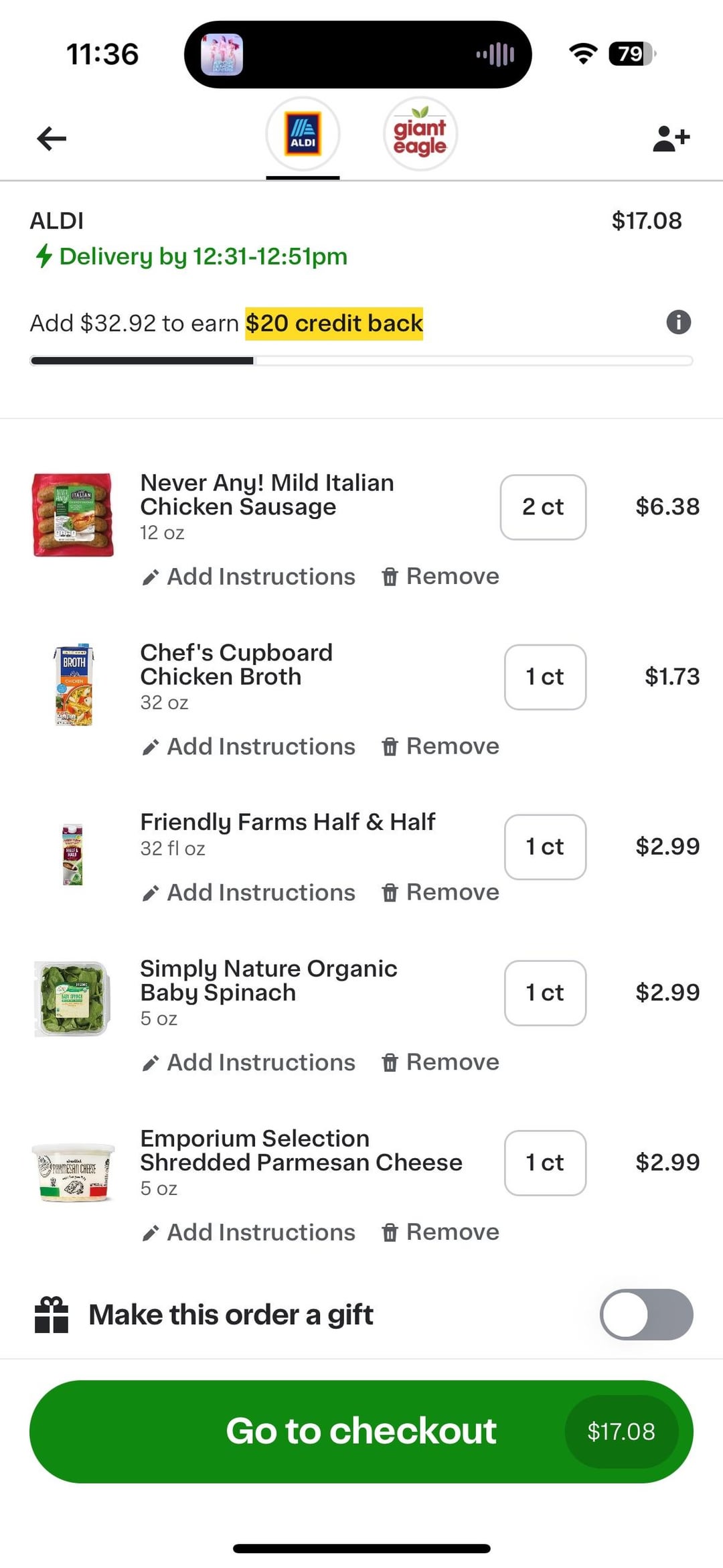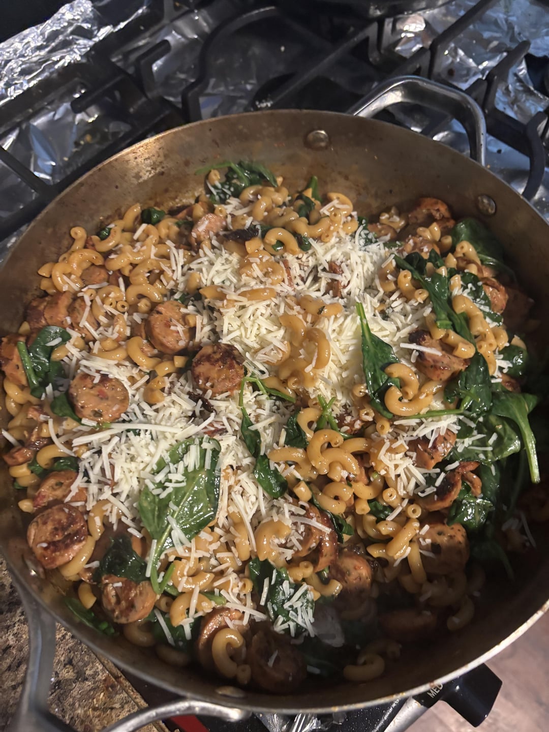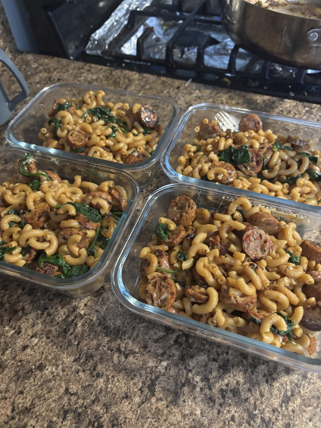 This week I made chicken sausage and pasta in one pan! Cook the chicken sausage for a little add in your pasta (the recipe said to use orzo but Aldi doesn’t have it so I used elbow macaroni) then throw in chicken broth, half and half, and seasonings. Once it’s boiling cover until the pasta is ready. Add in spinach and Parmesan cheese until cooked. The total cost of ingredients was $17.08 / 4 = $4.27 per meal!