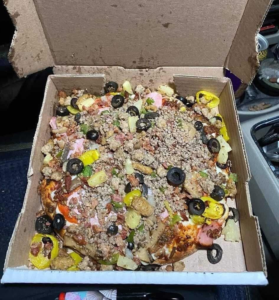 Did a raccoon make this pizza? This is atrocious. It looks like something you’d expect to find in the bottom of an Arby’s dumpster. Very guilty and very to jail.
