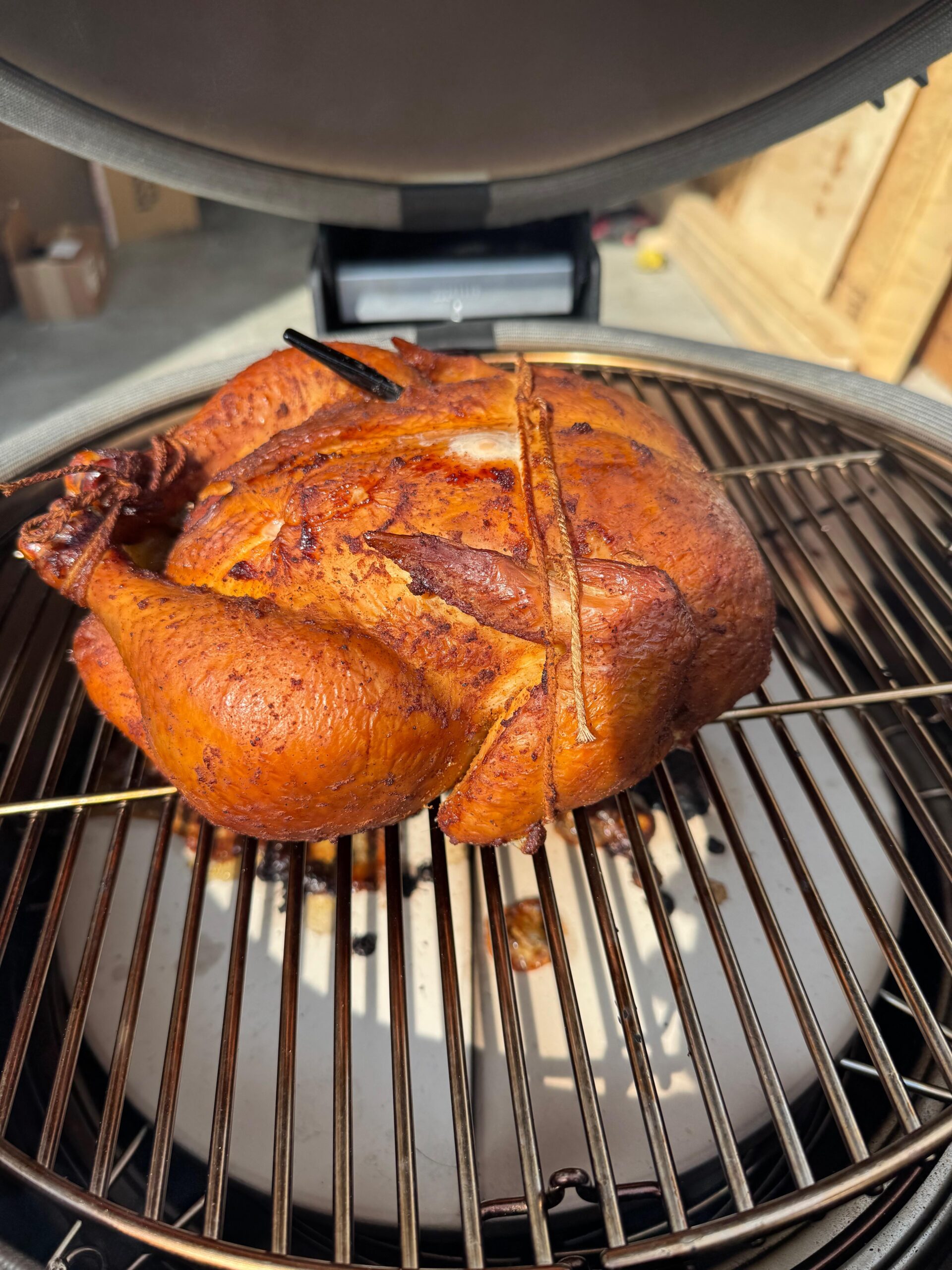 Smoked a whole chicken at 225 for about 3 hours. I used a mix of apple and maple wood. I was getting a little worried my breast thermometer was off, and almost pulled too early.