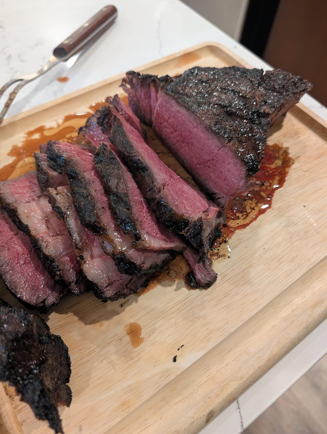 Seared 90 seconds per side. I'd probably bump this down to 60 seconds in the future. Pull, top with garlic butter and tent with foil.