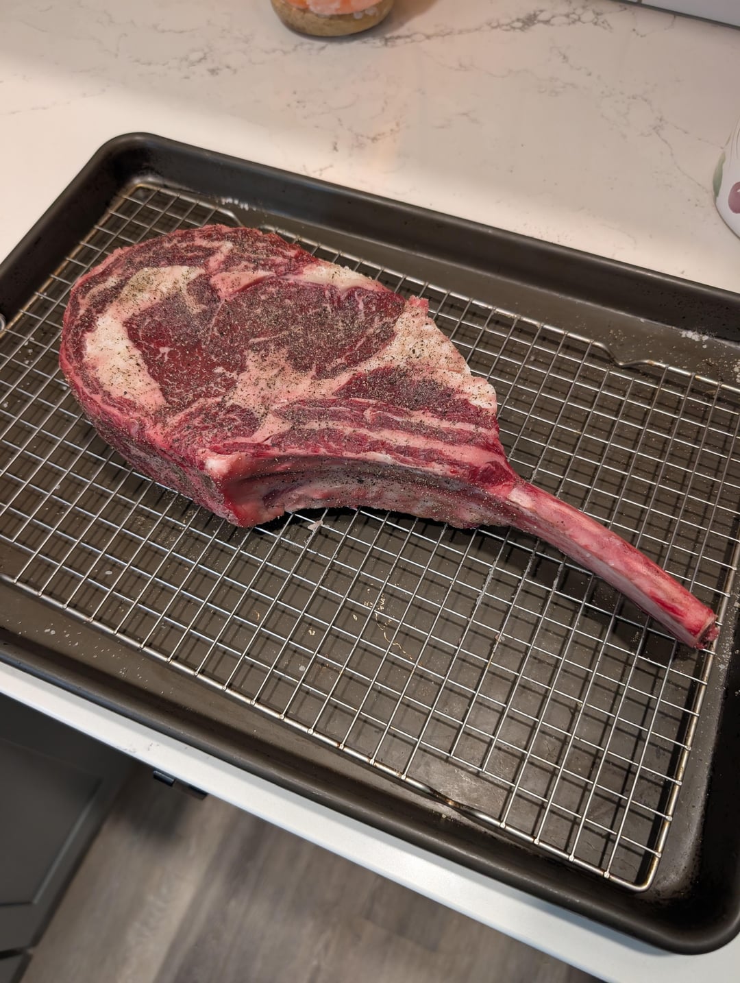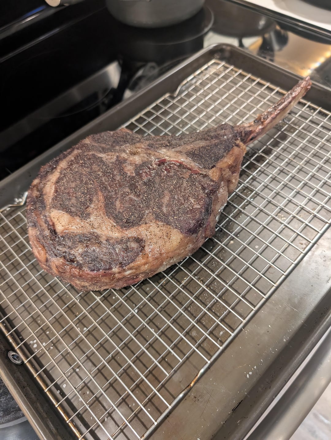 Dry brine steak uncovered in the fridge for 18 hours – .75% salt by weight. Ground black pepper.