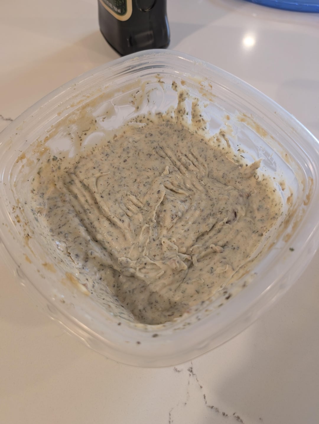Garlic butter: 6 heads of garlic, salted, drizzled in olive oil and wrapped in foil, roasted @ 400 for 1-1.5 hours. 3 sticks salted butter. ~4-5 tbsp dried herbs (dill, oregano, parsley). Save extra