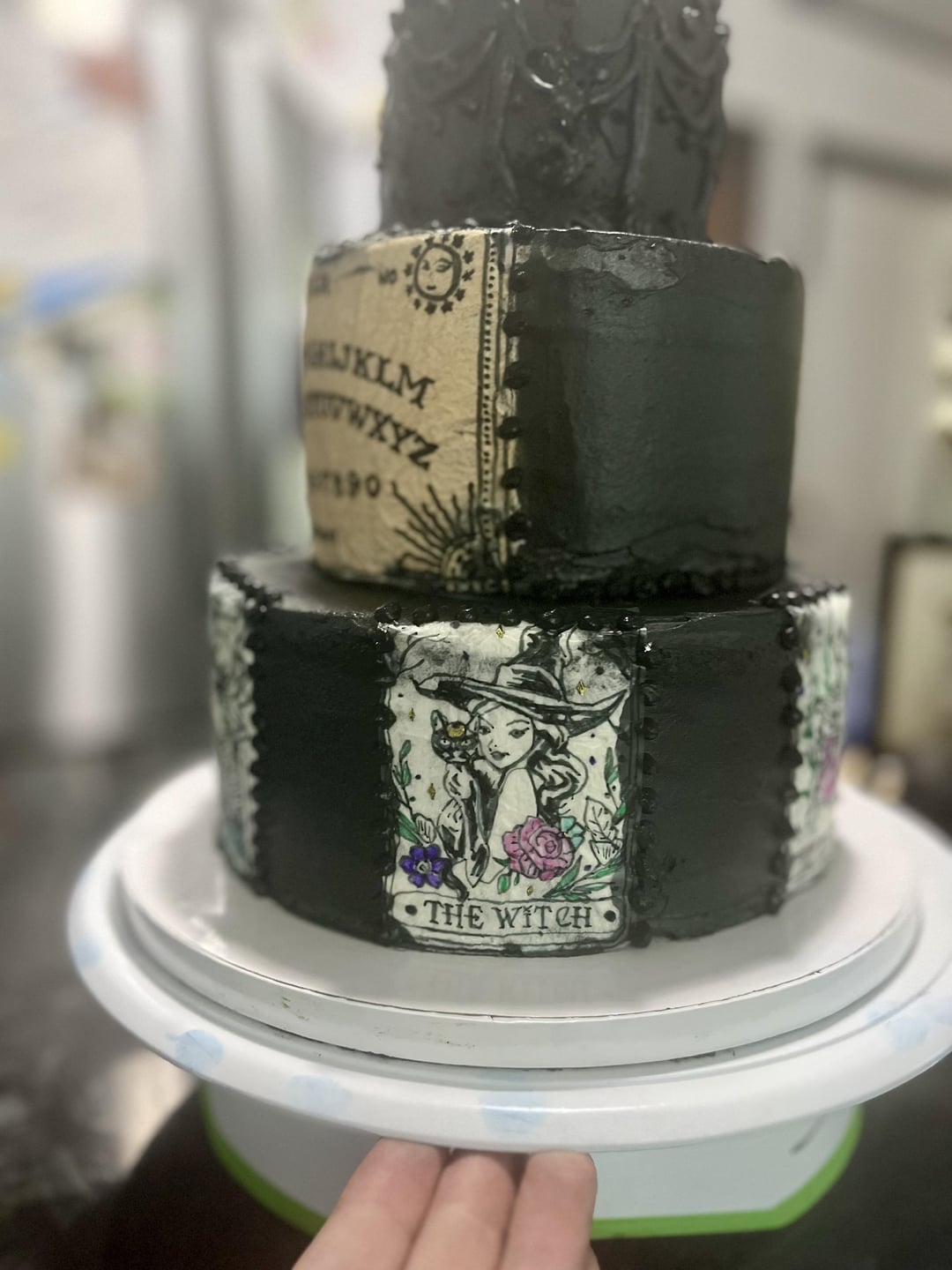 Back for another sober cake post! This years challenge element was wafer paper and edible markers, never worked with either and it was so fun to do the tarot cards, ouija board and planchette. I used activated charcoal to get the black buttercream.