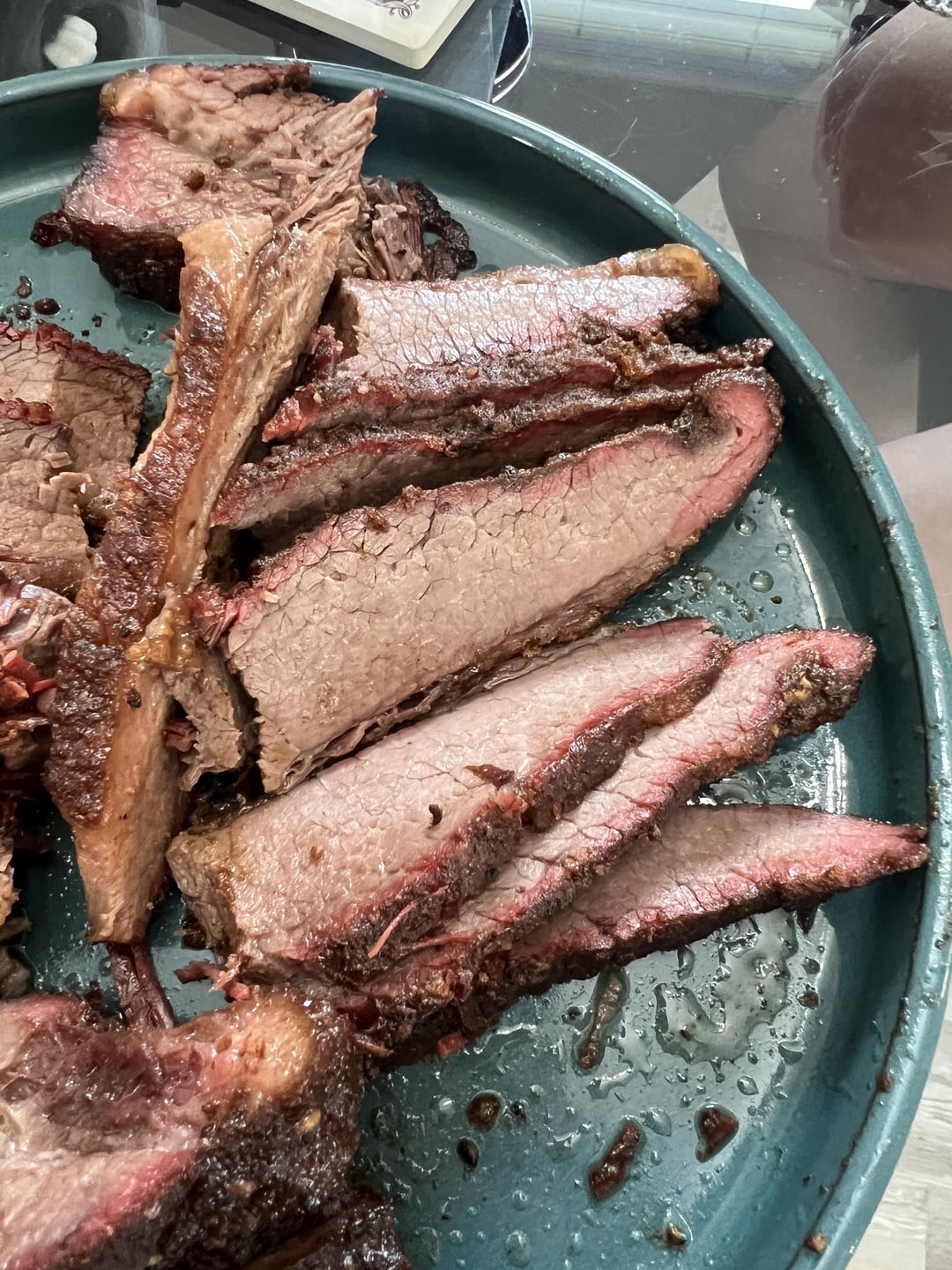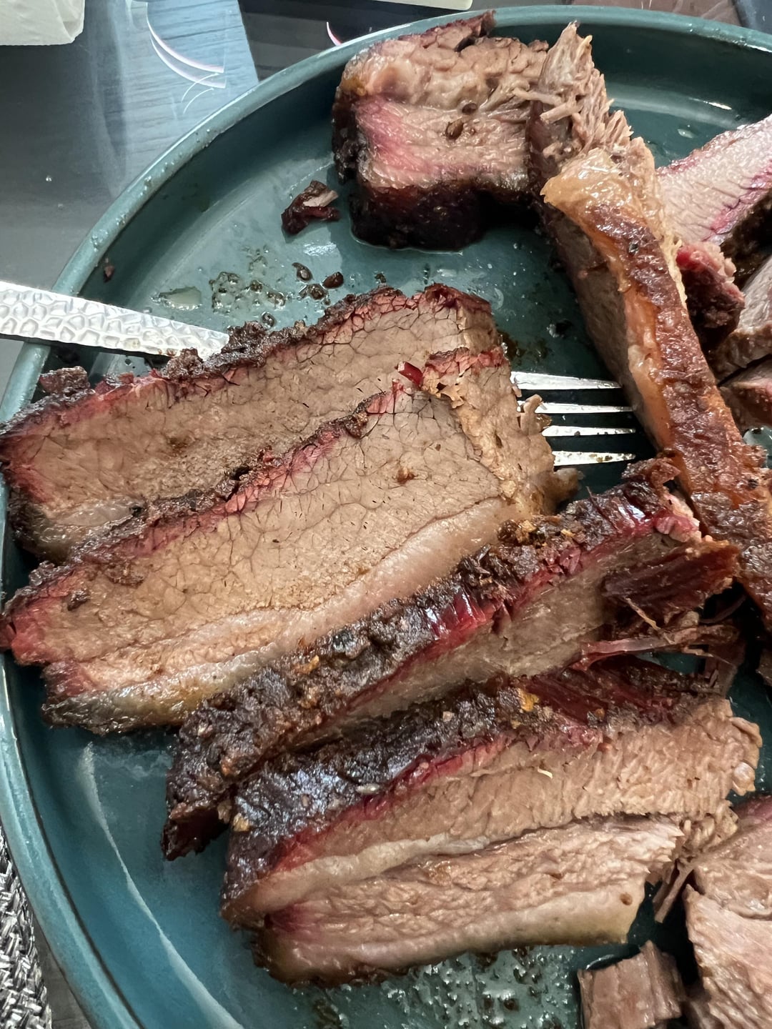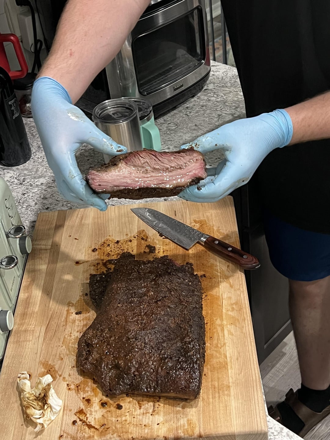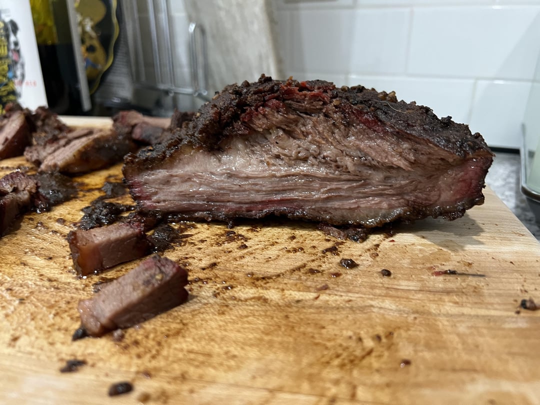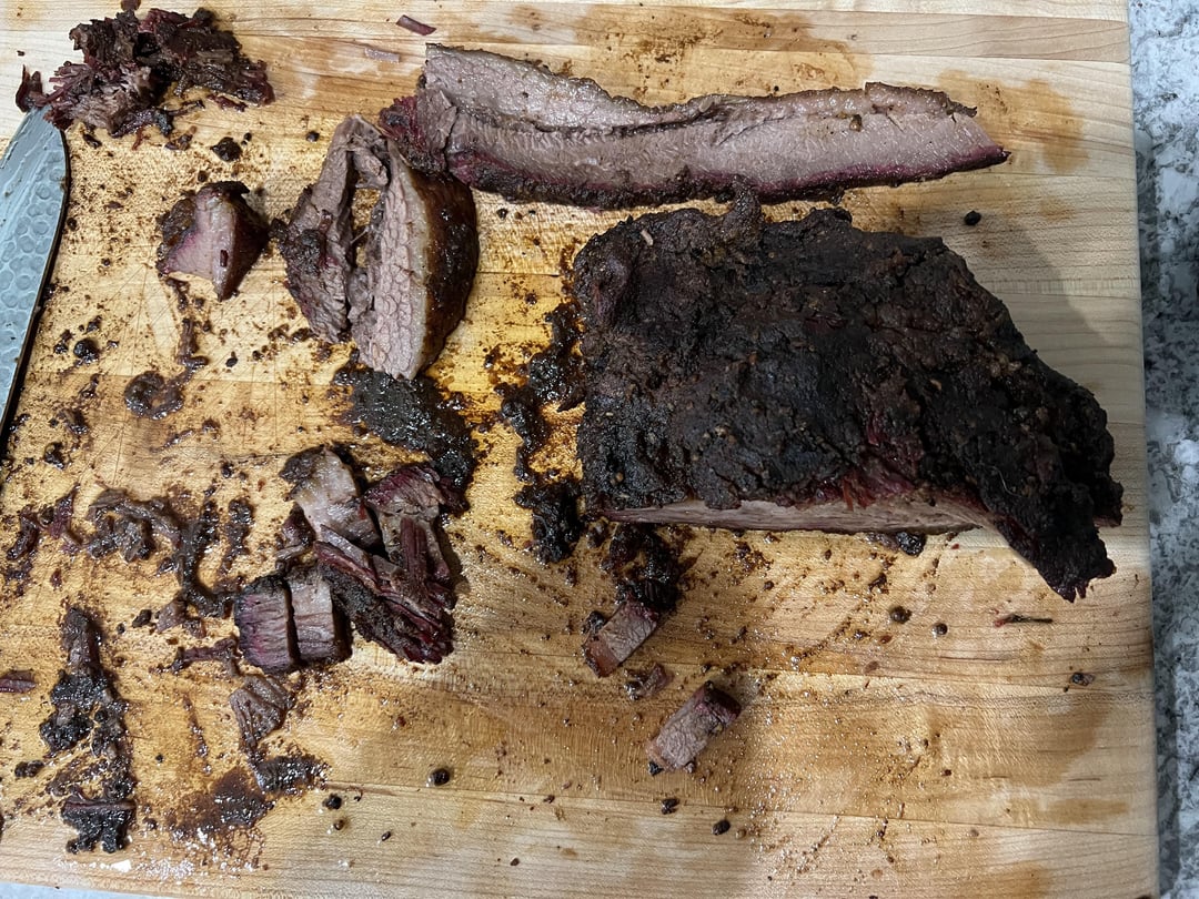 First brisket. Looking for some feedback on how I did. I kept it simple for the rub. Equal parts coarse kosher salt and coarse black pepper, some garlic and onion and paprika. Started at 12am Saturday @225. Wrapped at 160 in butcher paper around 9am. Pulled out at 200 and put in a cooler until it was around 150ish and cut the bad boy up! Got excited and just cut it up and didn’t check the grain. Looking for some feedback on what I can do next that would be better or if I messed up and can avoid that next time. Thanks yall. I did really enjoy this one !