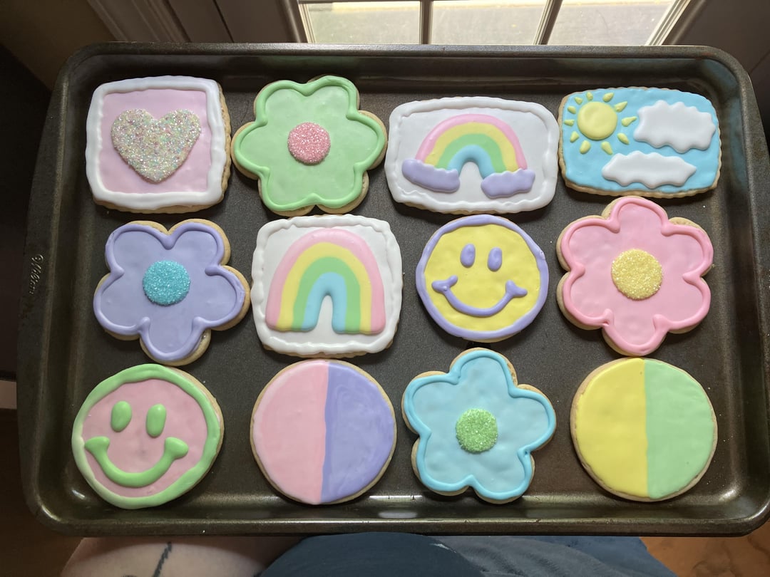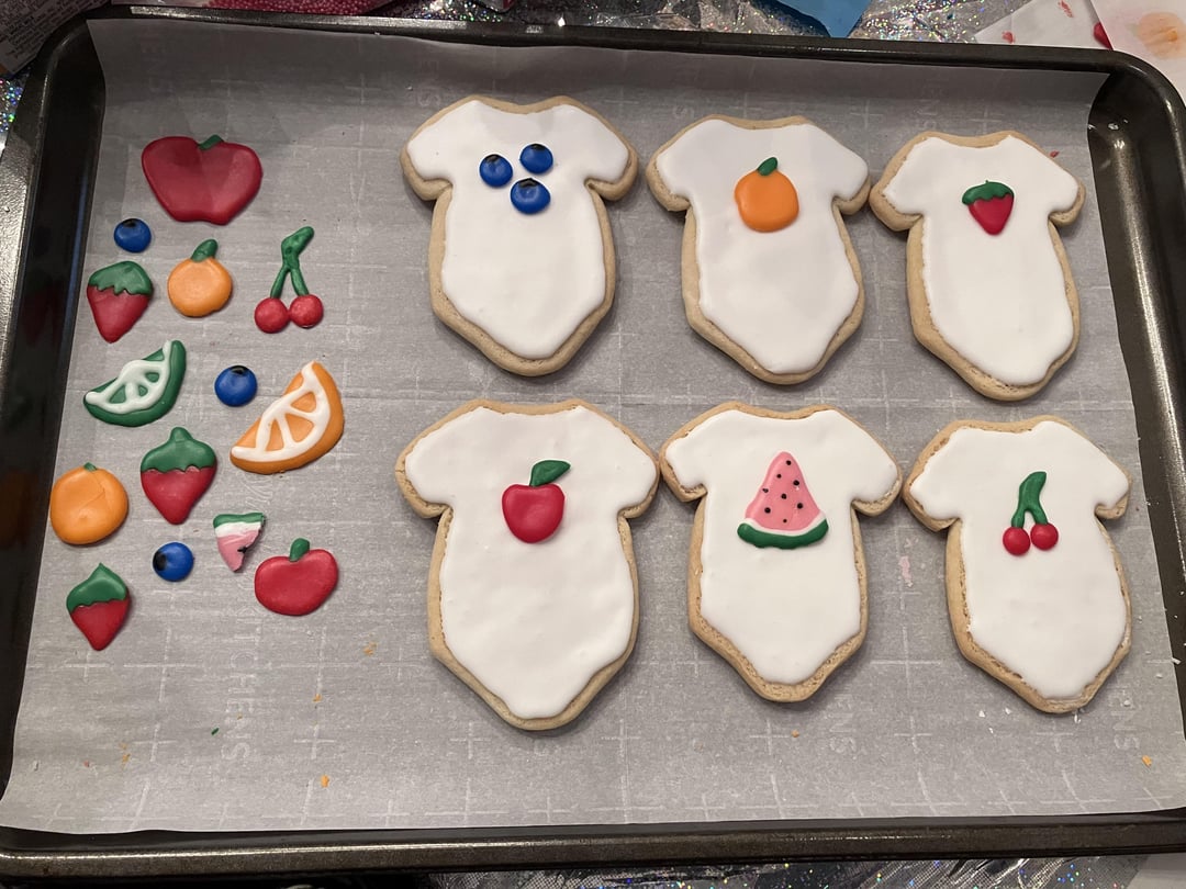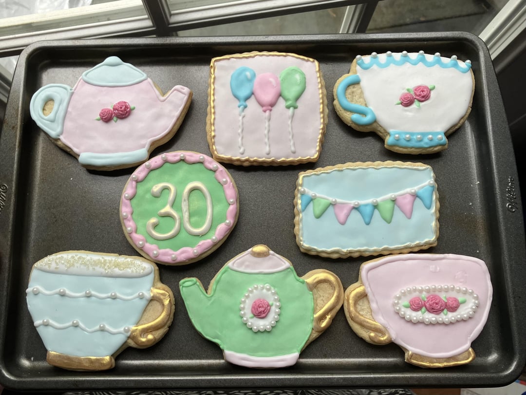 Started decorating casually earlier this year and have been having fun with pretty colors for summer recently! First pic is a cheerful y2k set I made for a friend’s care package, second one is tea party themed thir-tea-eth birthday cookies for another friend, and the third one is omg congratulations you’re pregnant cookies for yet another friend 🙂 The pictures are in reverse chronological order and I’d like to think that I’ve improved slightly since the onesies! Very open to feedback and suggestions if you have any 💖