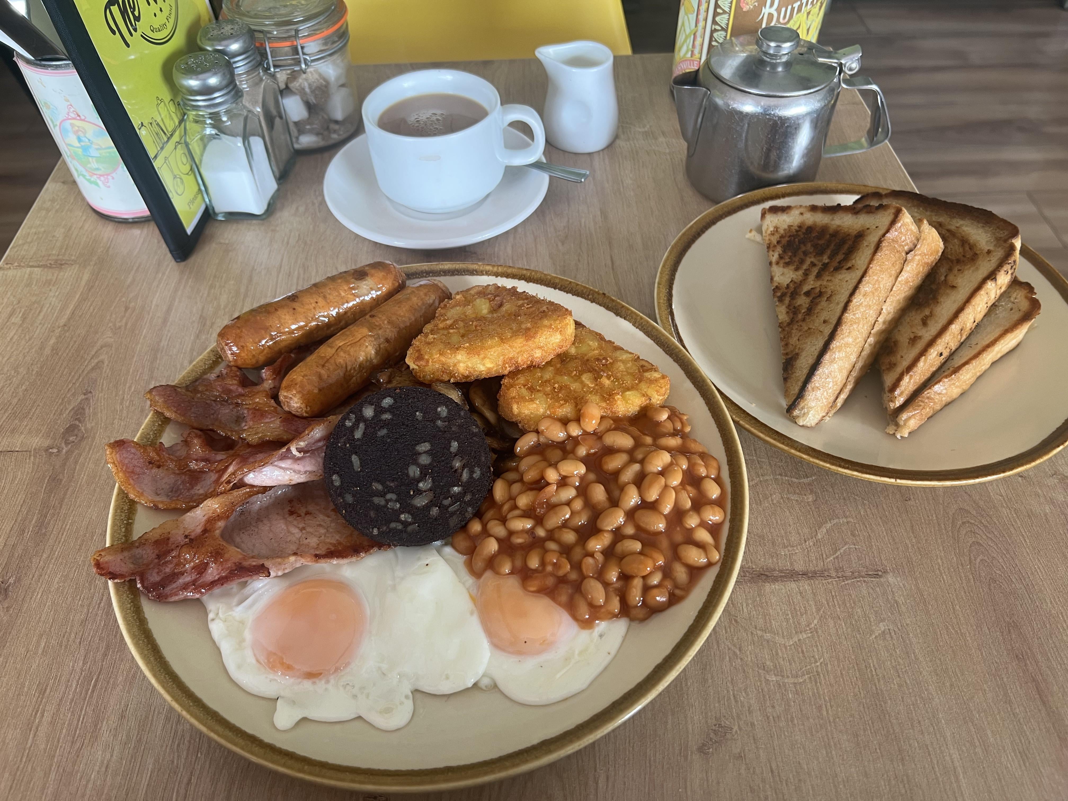 £13.50 – 3 bacon, 2 sausage, 2 eggs, 2 hash browns, plenty of beans, mushrooms (hidden under hash browns), and black pudding. I opted for 2x fried bread, toast/bread available instead. Tomatoes also included but I removed them. Including a pot of tea too!