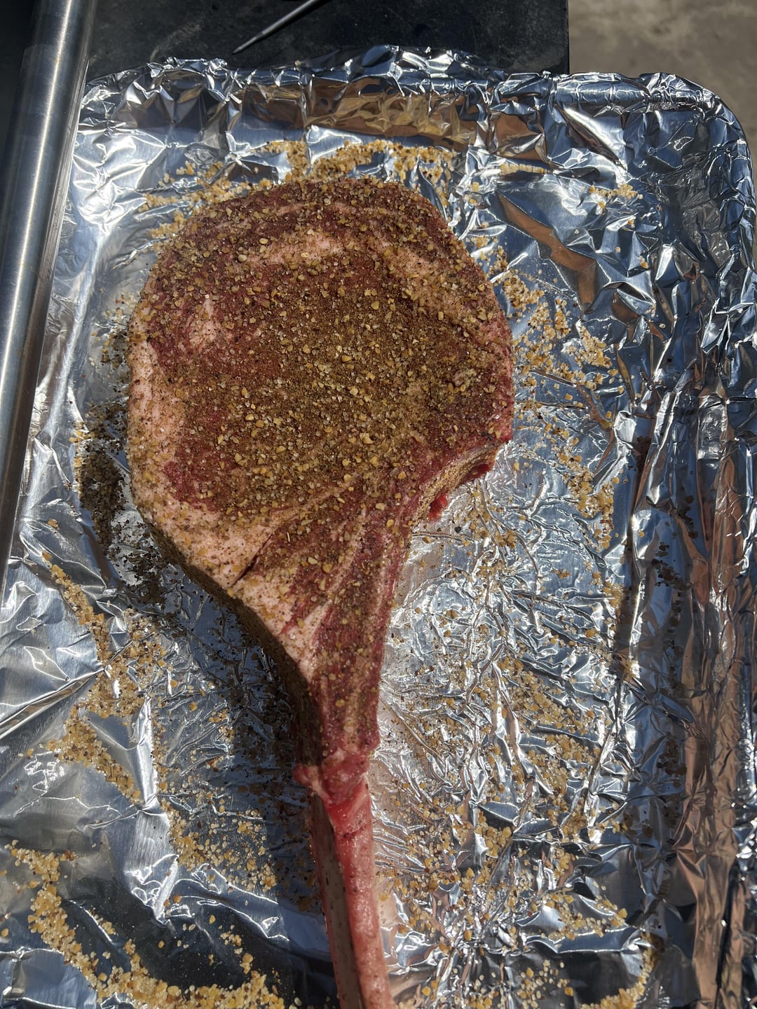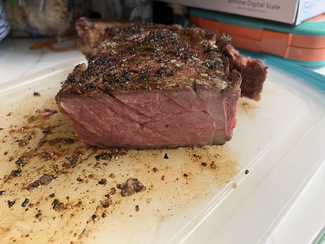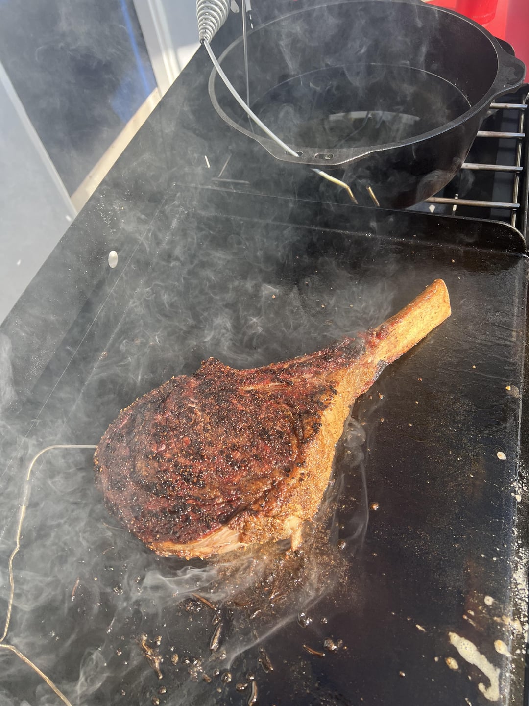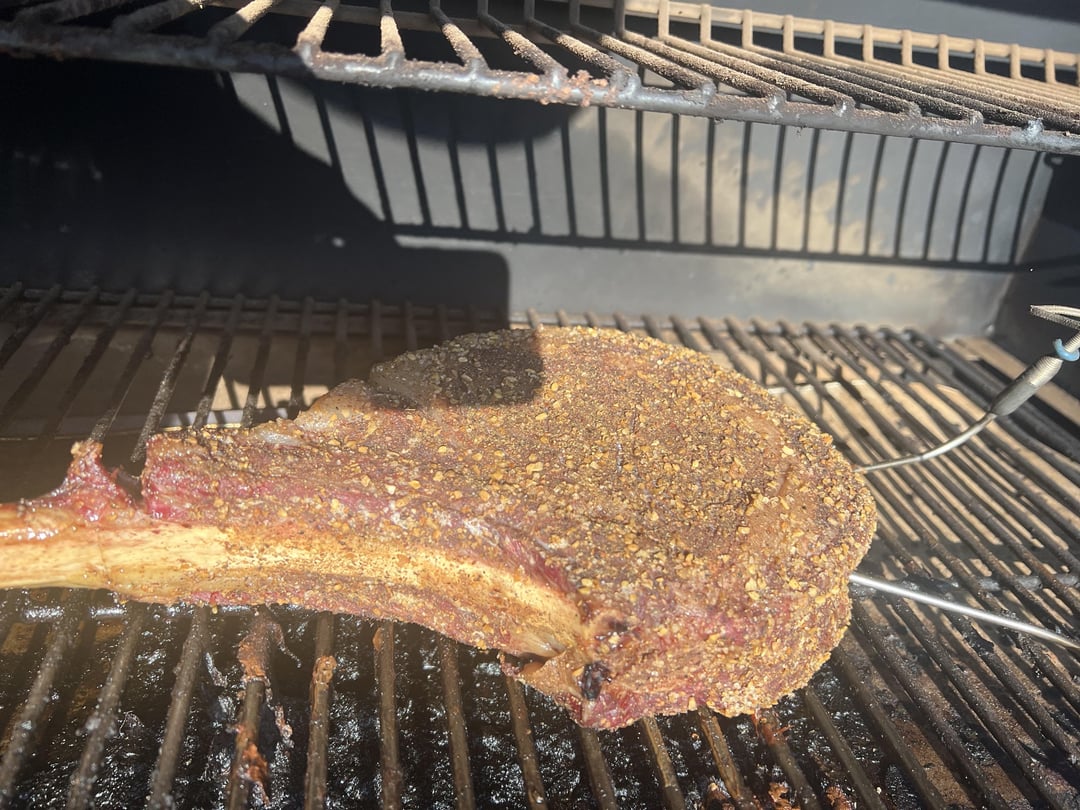 Costco had Prime Tomahawks for what seemed like a good price to me (19.99/lb). Hadn’t done a cut that nice before so I smoked it to 115 internal then seared it on my camp chef with rosemary salt butter and fresh rosemary from my garden, rested with more of the same for a great final product.