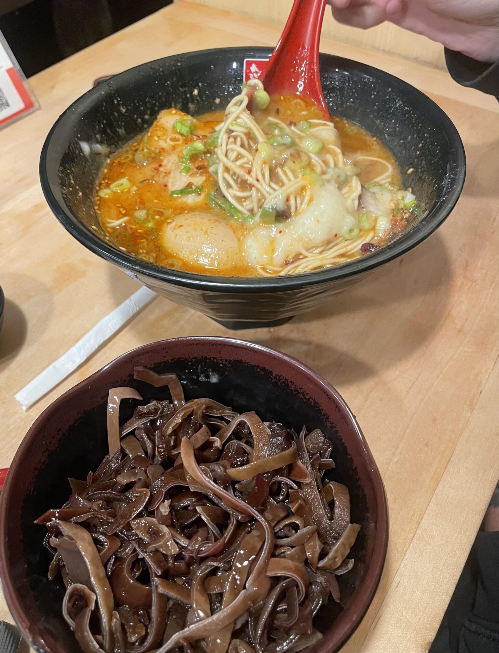 what is going on here- Eating noodles with a spoon? A huge side dish of cloud ear mushrooms?