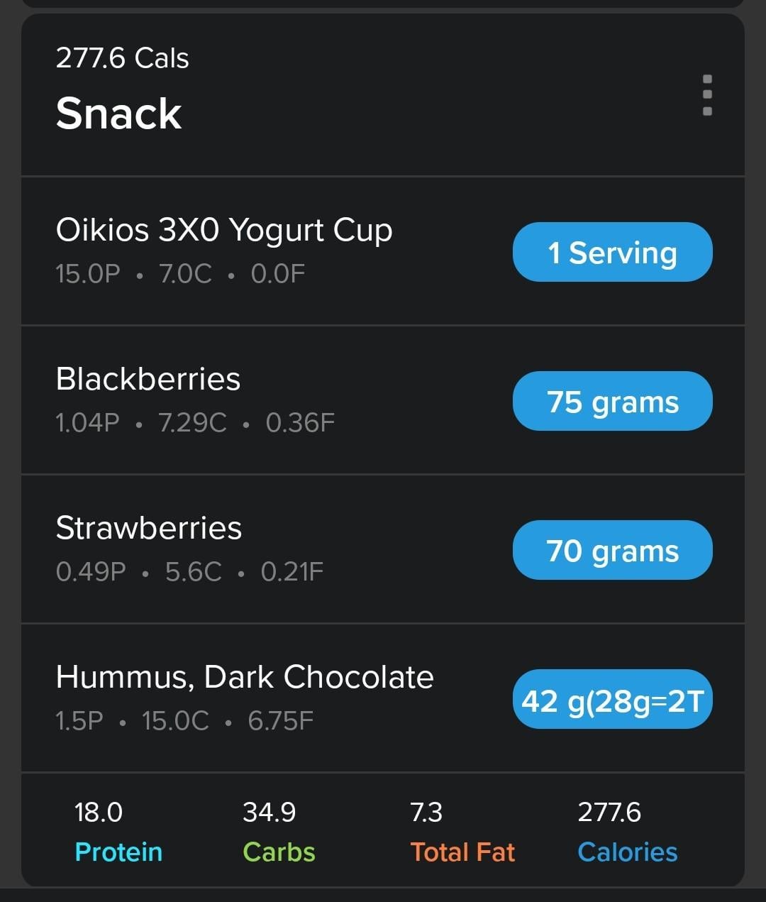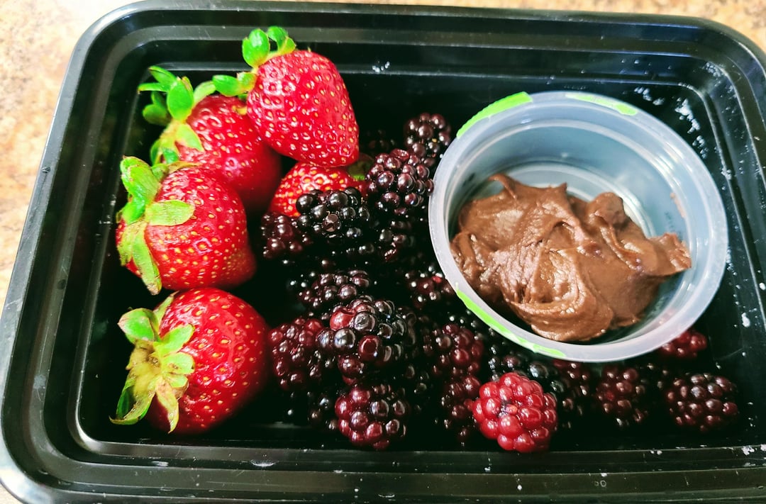Snack 1: fresh strawberries and homegrown blackberries, dark chocolate hummus and a yogurt cup.
