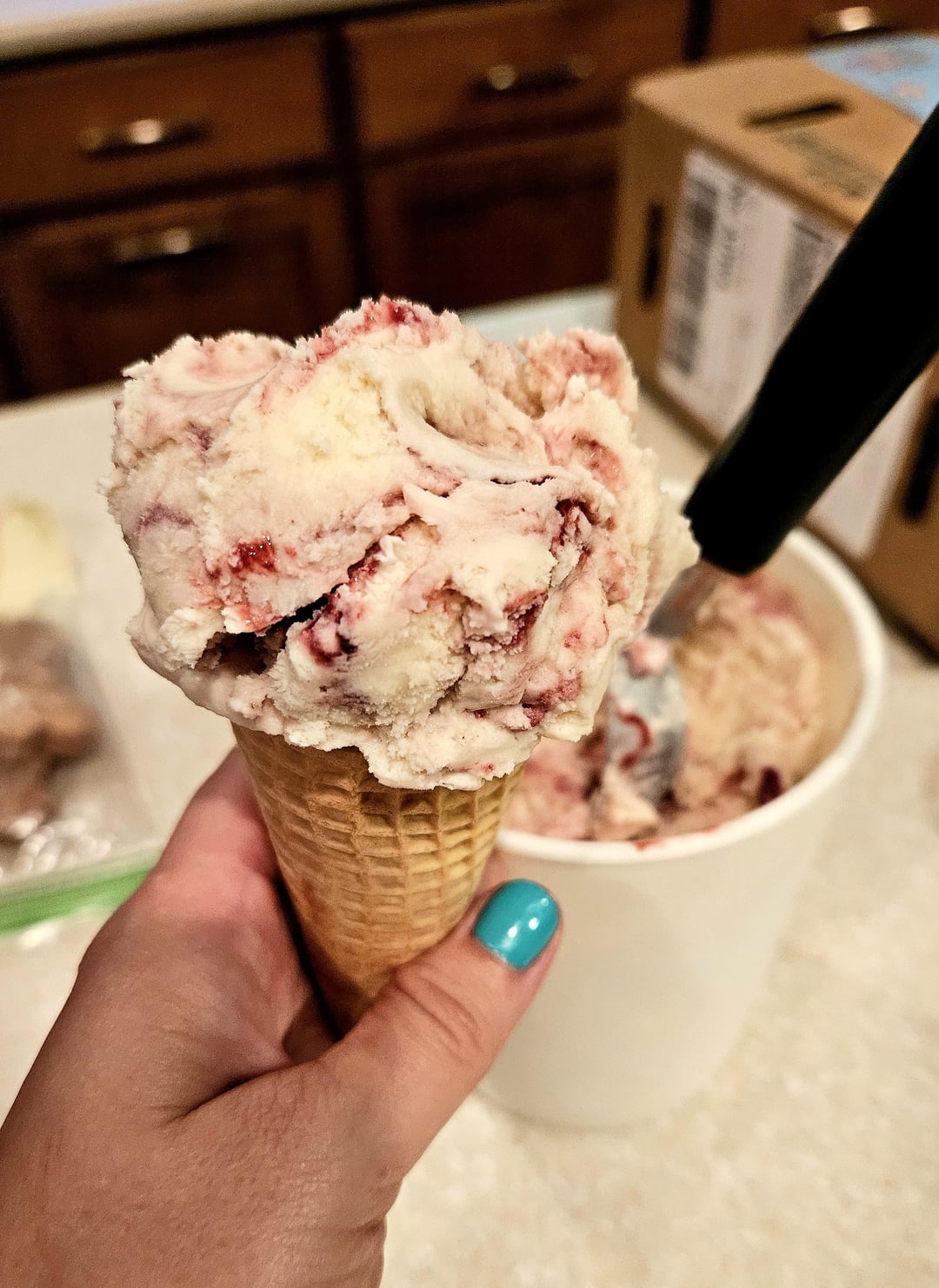 Vanilla ice cream base with blackberry balsamic syrup swirled throughout. I made the syrup from wild blackberries that I forgaged for in a nearby field. The flavors of the vanilla and syrup create an amazing contrast of flavors that pair really well together. This is definitely going to be my new go-to summer staple flavor.