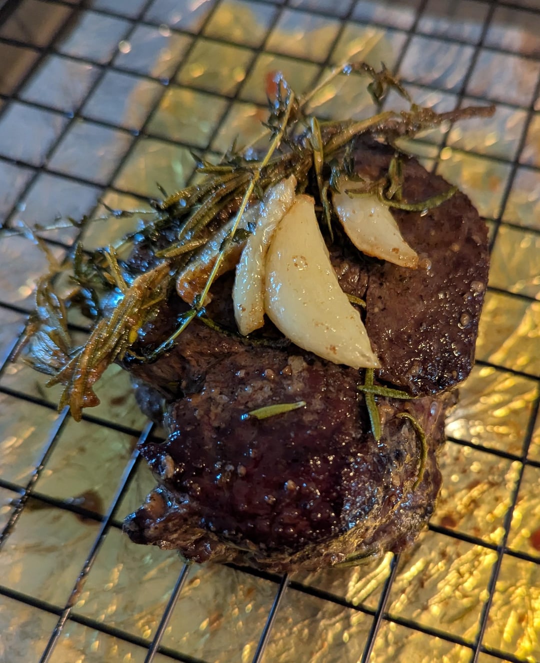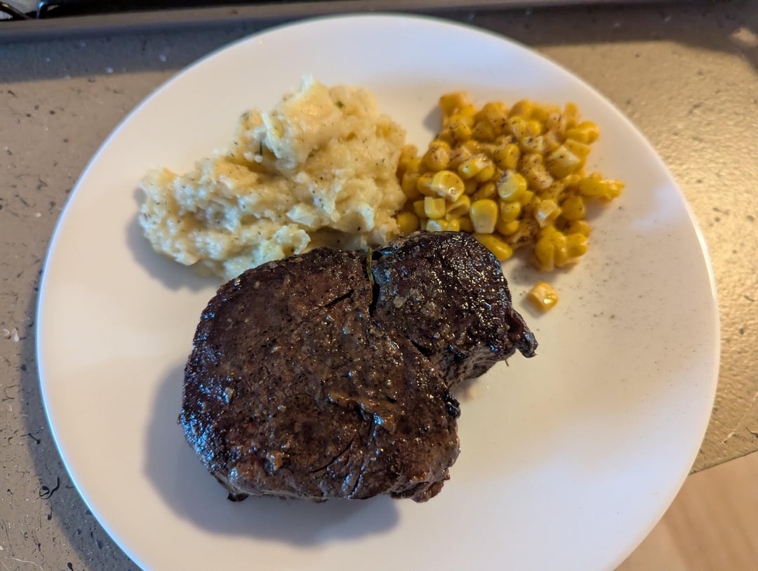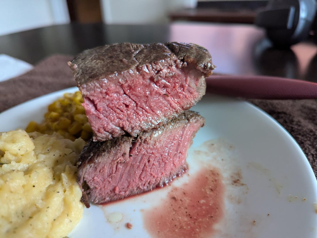 Picked up an 8 oz filet from my local butcher, I've never cooked one before. Just seasoned it with salt and pepper, seared it in a cast iron pan and butter basted it until it hit 123°F internal and let it rest, and it ended up hitting 133°F internal. I was going for a medium rare.