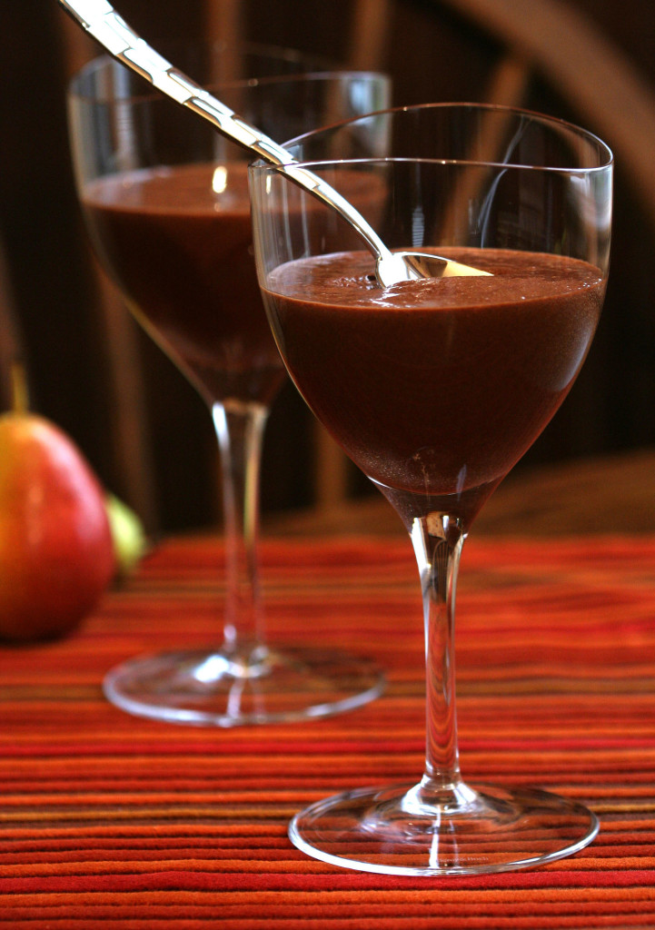 This cherry-chocolate mousse calls for cherry brandy, the sweet viscous red liqueur (not the transparent fire-water that is kirsch, though you could use it as a substitute). If you prefer the idea of a chocolate orange mousse, substitute Cointreau. Rum works well, too. Or you could use coffee in place of the alcohol.