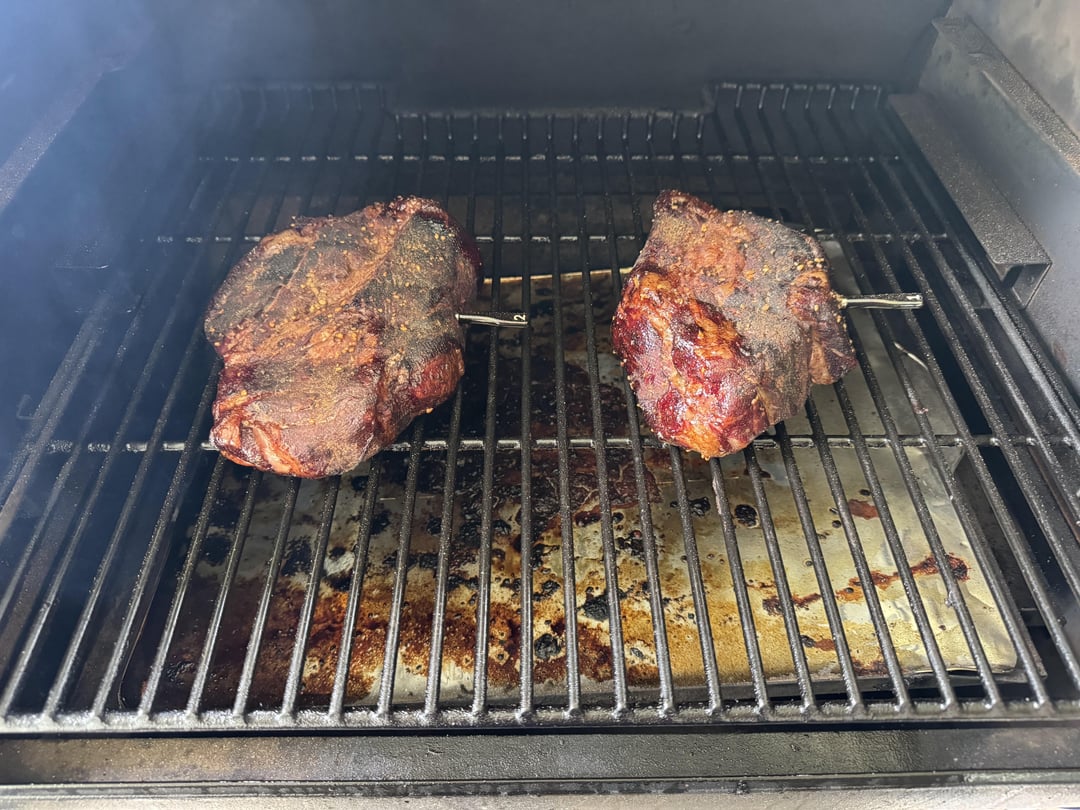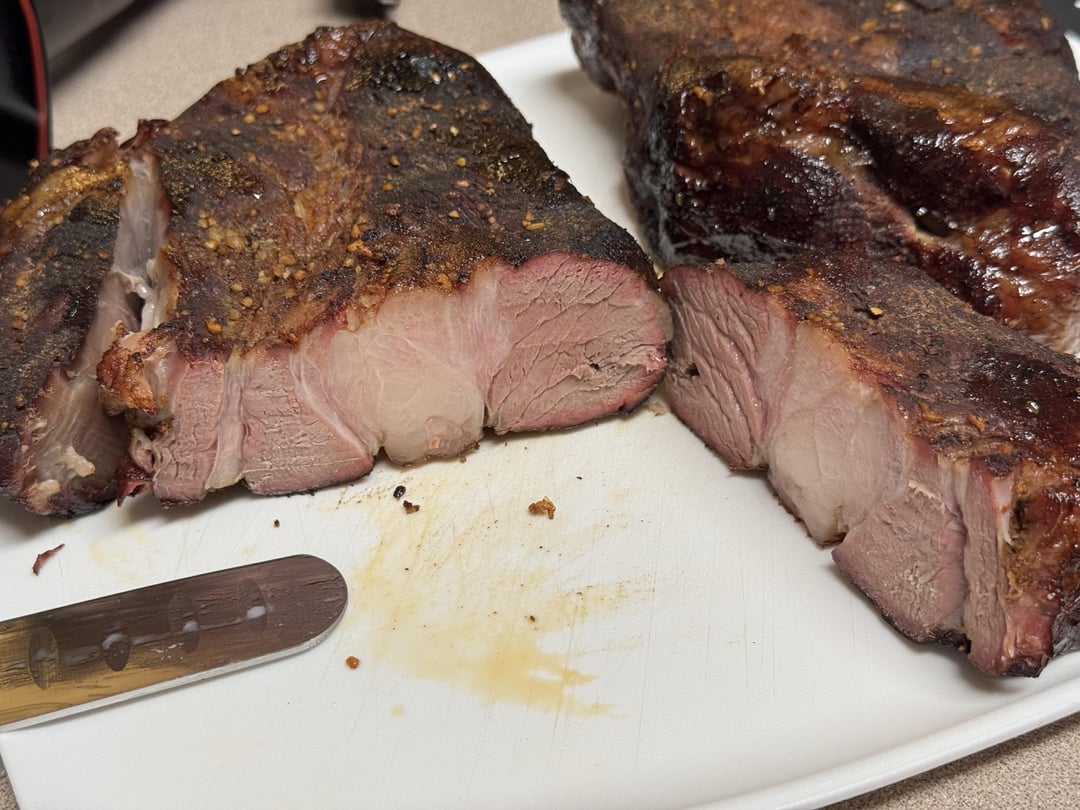 Apologies, wife won’t eat less than medium well. Choice chuck roast seasoned overnight with Boo Yah, 140 for 30 hours, ice bath then refrigerated overnight, patted dry then seasoned with a bit more Boo Yah, thrown on Traeger at 225 to an internal temp of 140. Delicious, juicy, and as tender as a ribeye. It’s a keeper.