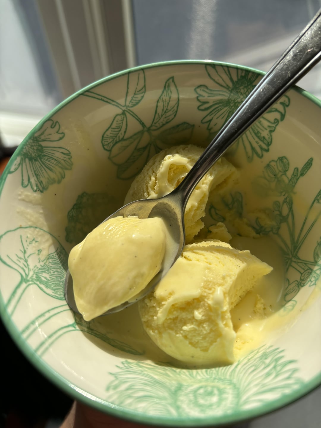 these photos are unedited, it is actually that yellow!! french ice cream uses a large amount of egg yolks which gives the ice cream the yellow color, plus I was lucky enough to be able to have some eggs from a friend’s chickens which are very healthy spoiled chickens with rich orange egg yolks, which produced the most rich and flavorful indulgent ice cream you can imagine. I used my last 2 vanilla beans on this and it was very worth it, and I made a big batch but it’ll be gone quickly for sure!