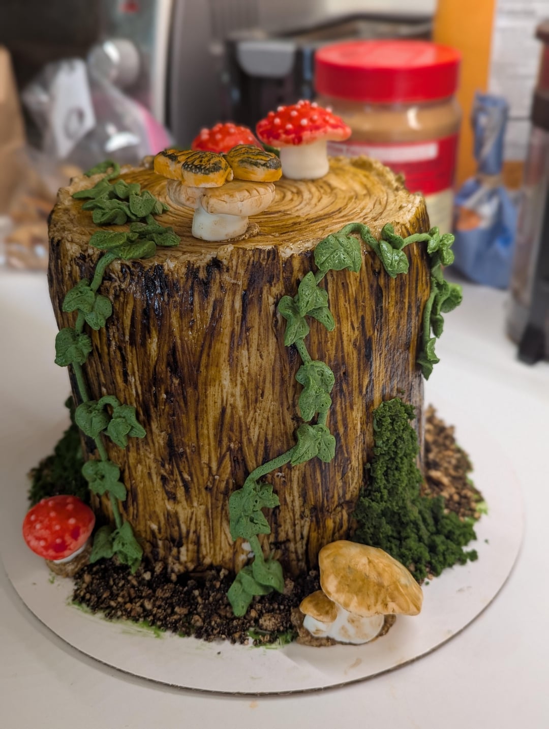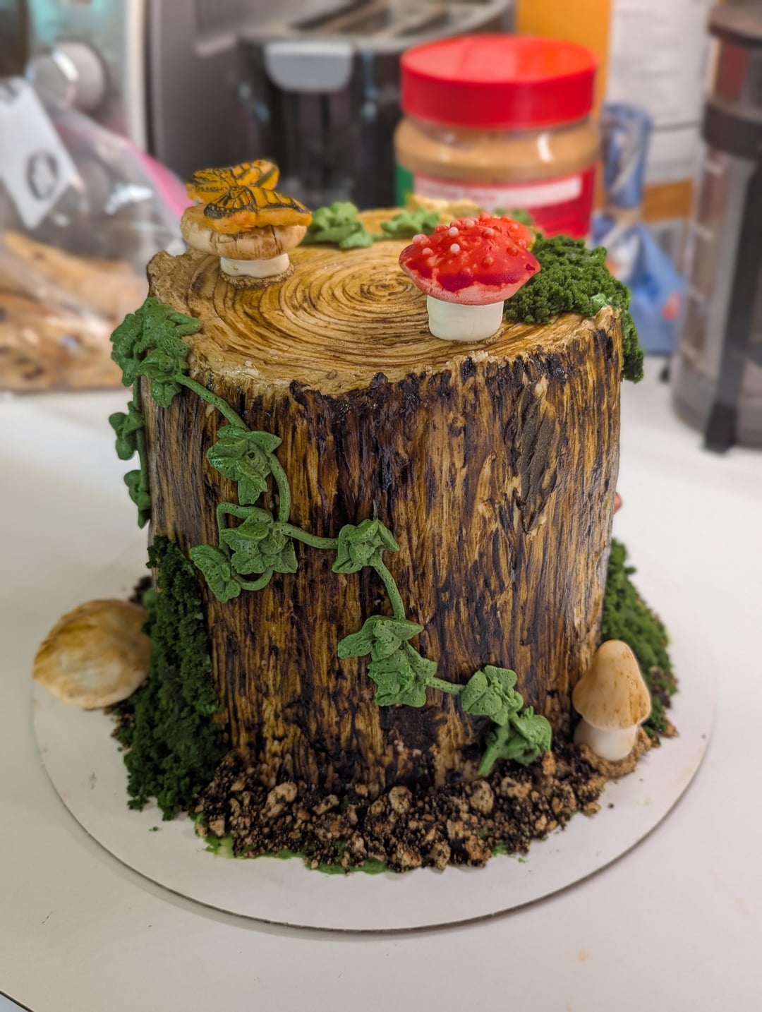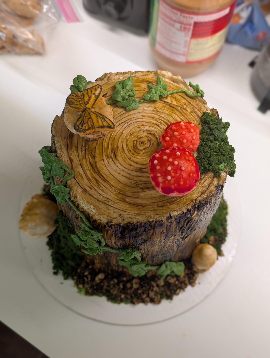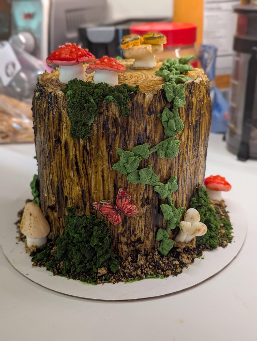 First time working with Swiss meringue buttercream AND fondant. Buttercream icing that I painted with food coloring for the trunk. Buttercream vines. Fondant mushrooms and butterflies (also painted). The dirt is crushed graham crackers with food coloring and the moss is green cake pieces.