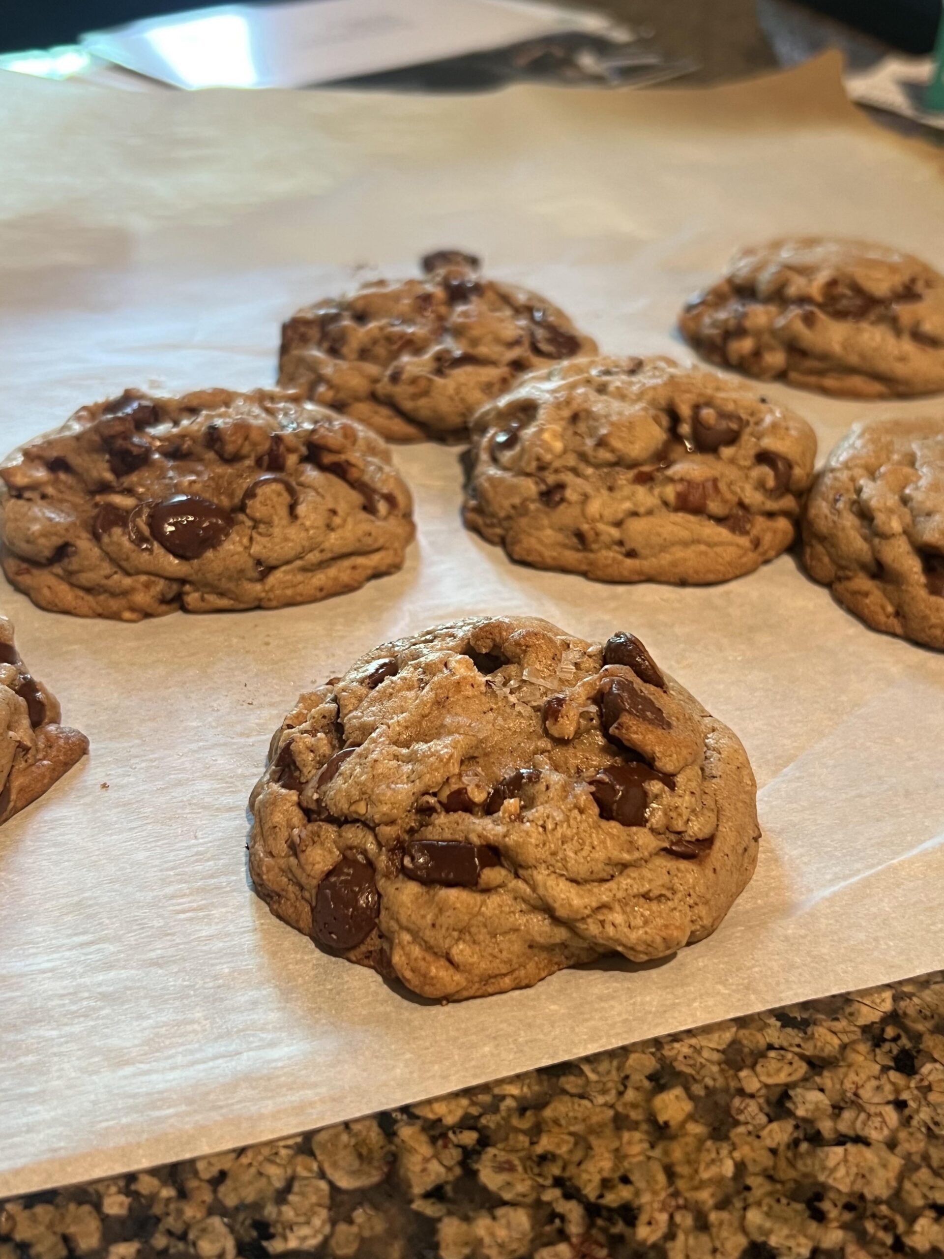 This is almost exactly my cookie recipe with difference add-ins(that varies anyway) but no maldon salt. The sugar ratio came from the Good Eats chocolate chip cookie episode.