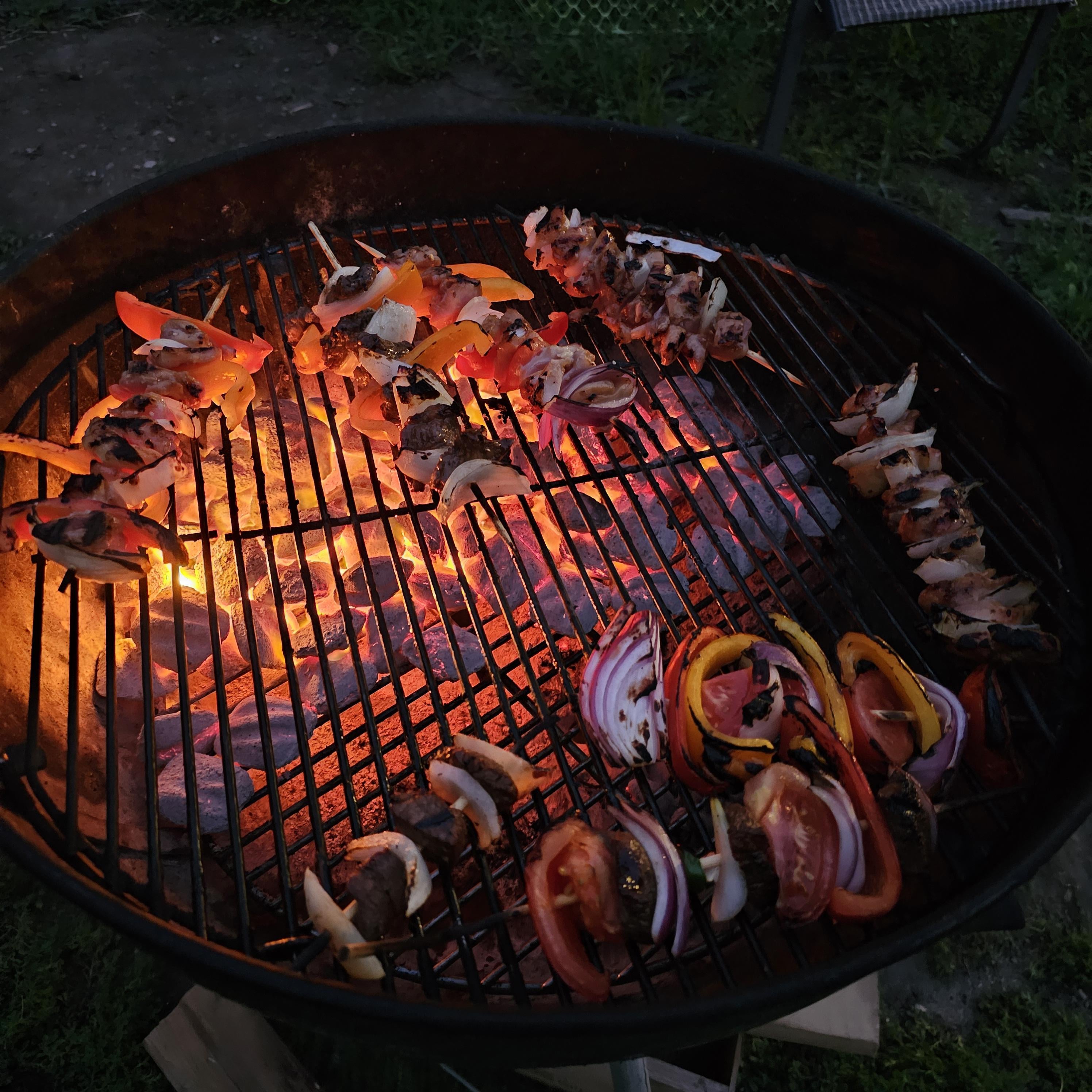 The marinade roughly goes such as: for the beef, wershierchshire sauce, dedgion mustard, veg oil, pepper, jamacian jerk, red wine vinegar, soy sauce, and probably some other things – for the chicken, off the shelf teriyaki sauce! sat in there for a few hours before skewer, it was very good! The charring did not add a burnt taste! 🙂